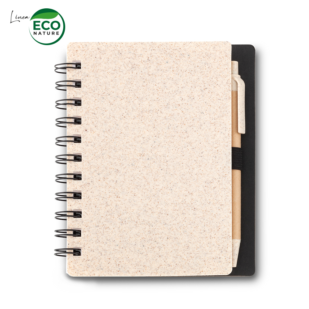 Libreta de 80 hojas de 70g de papel blanco con rayas cubiertas en partes plasticas con fibra de trigo Incluye boligrafo plastico con barril en carton y partes plasticas con fibra de trigo Mecanismo push Mezcla con material ecologico en fibra de trigo (50% aprox) El porcentaje de material ecologico tiene un promedio de biodegradabilidad de 2-3 anos despues del fin de su vida util