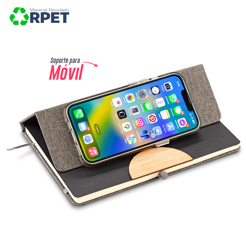 Libreta con soporte para telefono tapa dura en RPET tamano A5 con adorno de bambu 80 hojas interiores rayadas de 70 g/m²