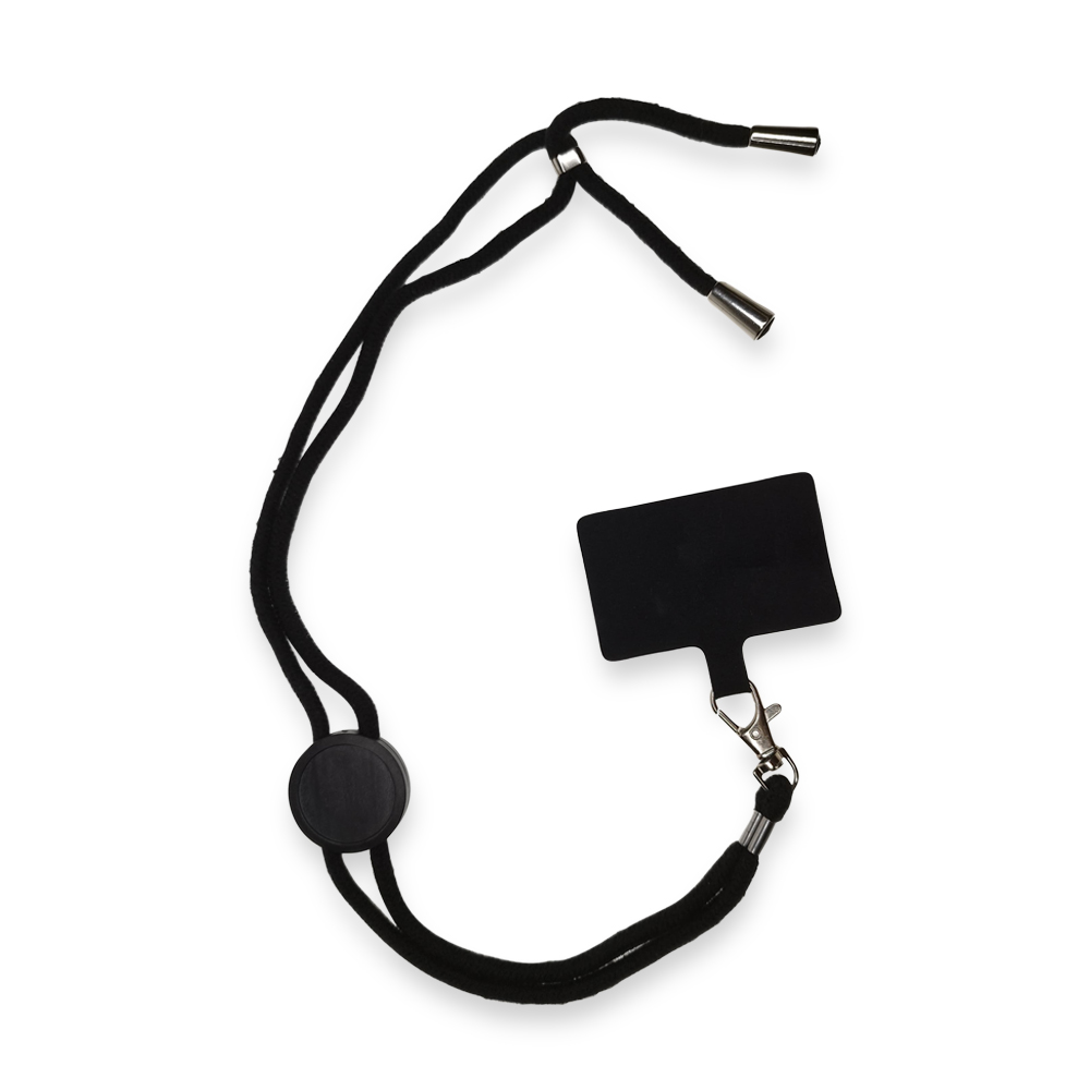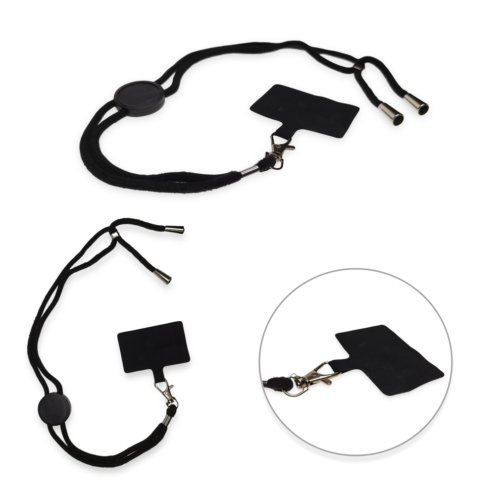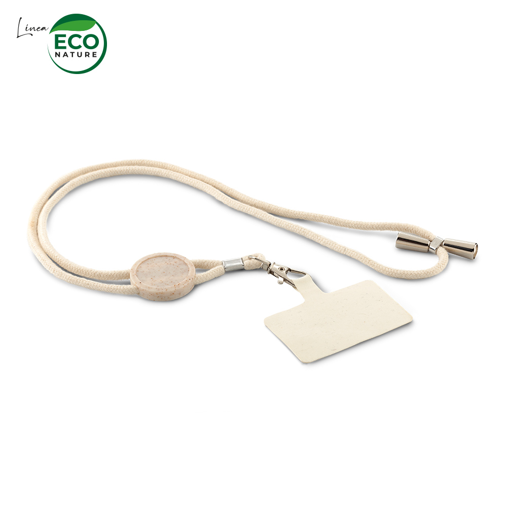 Cinta portacarnet en algodon con gancho metalico y partes en plastico ecologico de fibra de trigo Con tarjeta para insertar en forro del movil