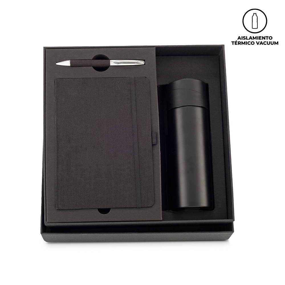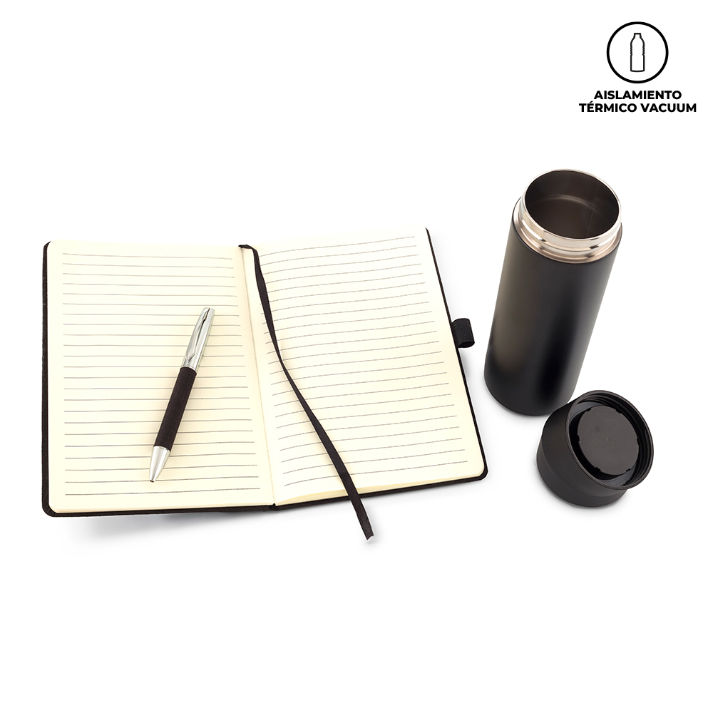 Set de libreta con tapa dura en RPET de 21 cm x 14.5 cm de 80 hojas rayadas. Botilito de 450 ml, doble pared vacuum en acero inoxidable, con aislamiento térmico que mantiene la bebida fría o caliente hasta 6h, aprox (puede variar dependiendo condiciones climáticas). Bolígrafo metálico con barril en tela y clip metálico, tipo twist. Empaque caja individual.