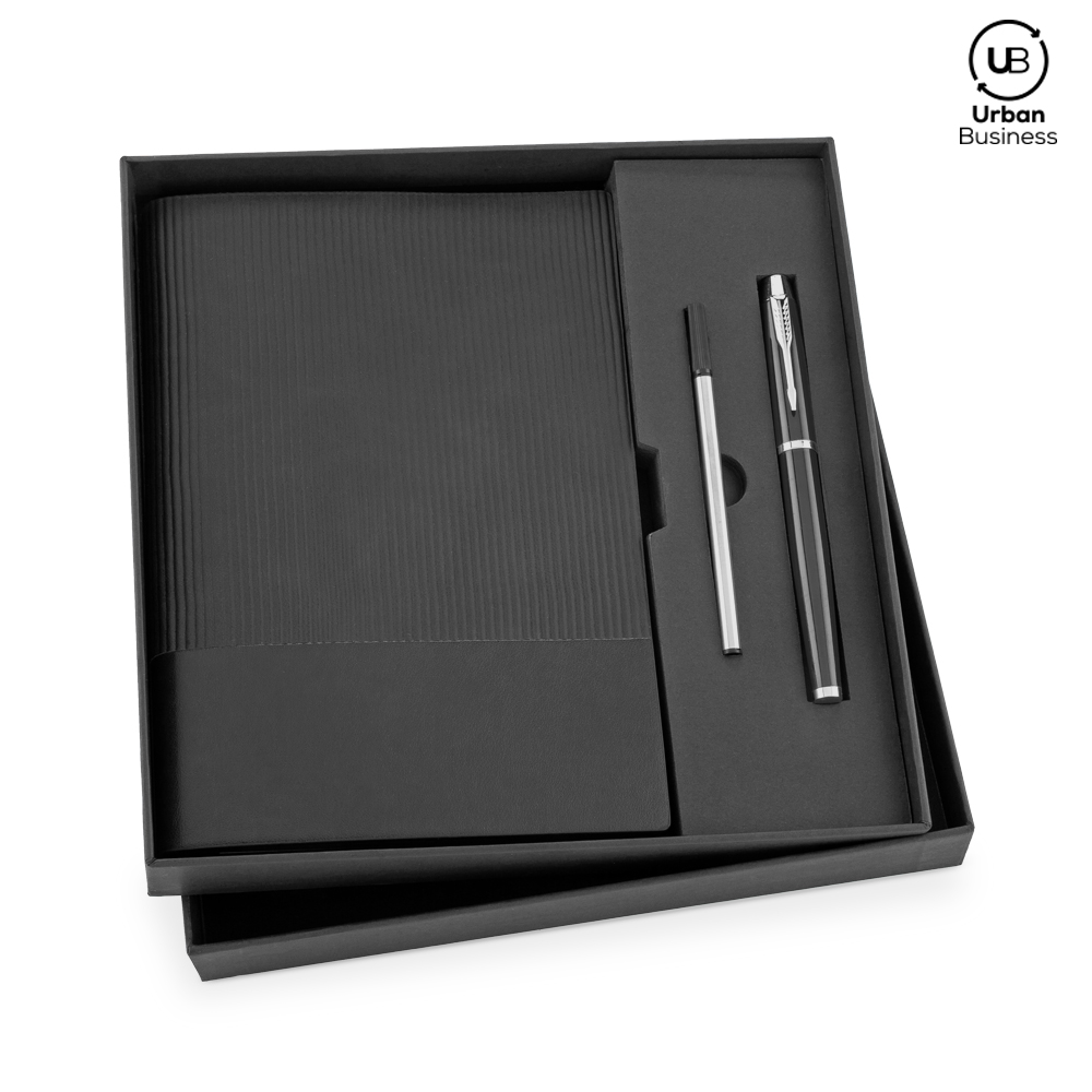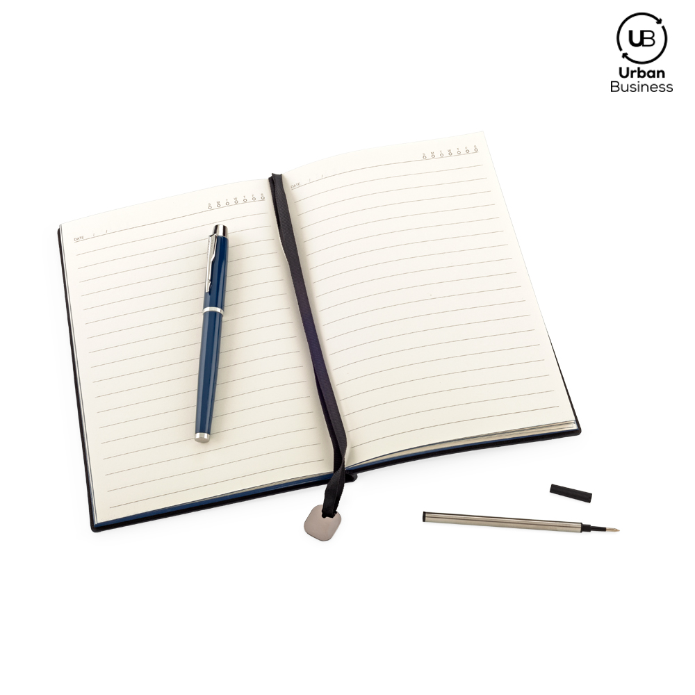 Set de libreta de 21 cm x 14.5 cm de 96 hojas rayadas con cubierta en PU, bolígrafo metálico roller y repuesto de mina. Empaque caja individual.
