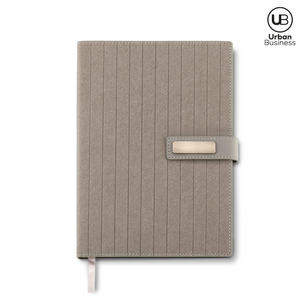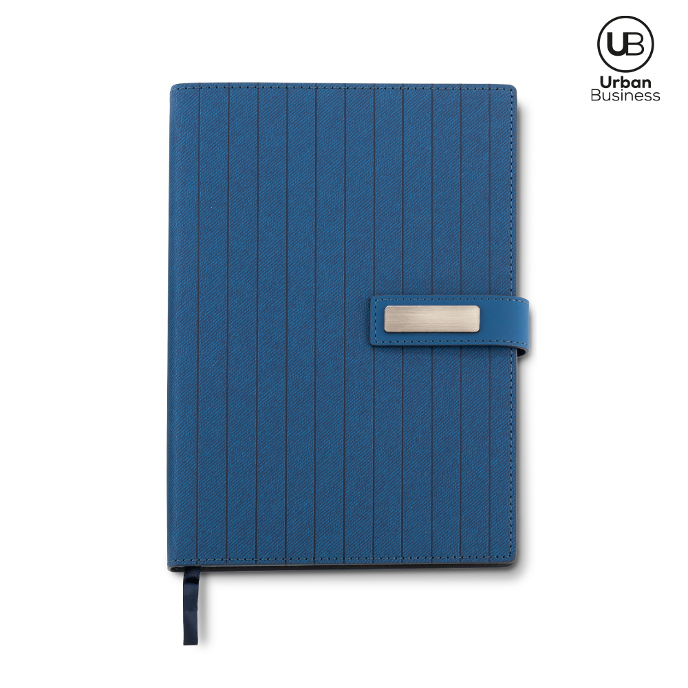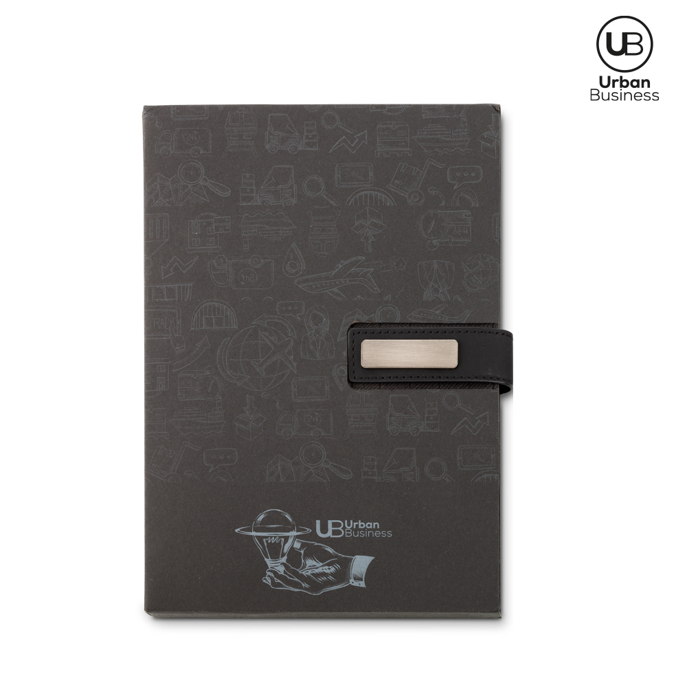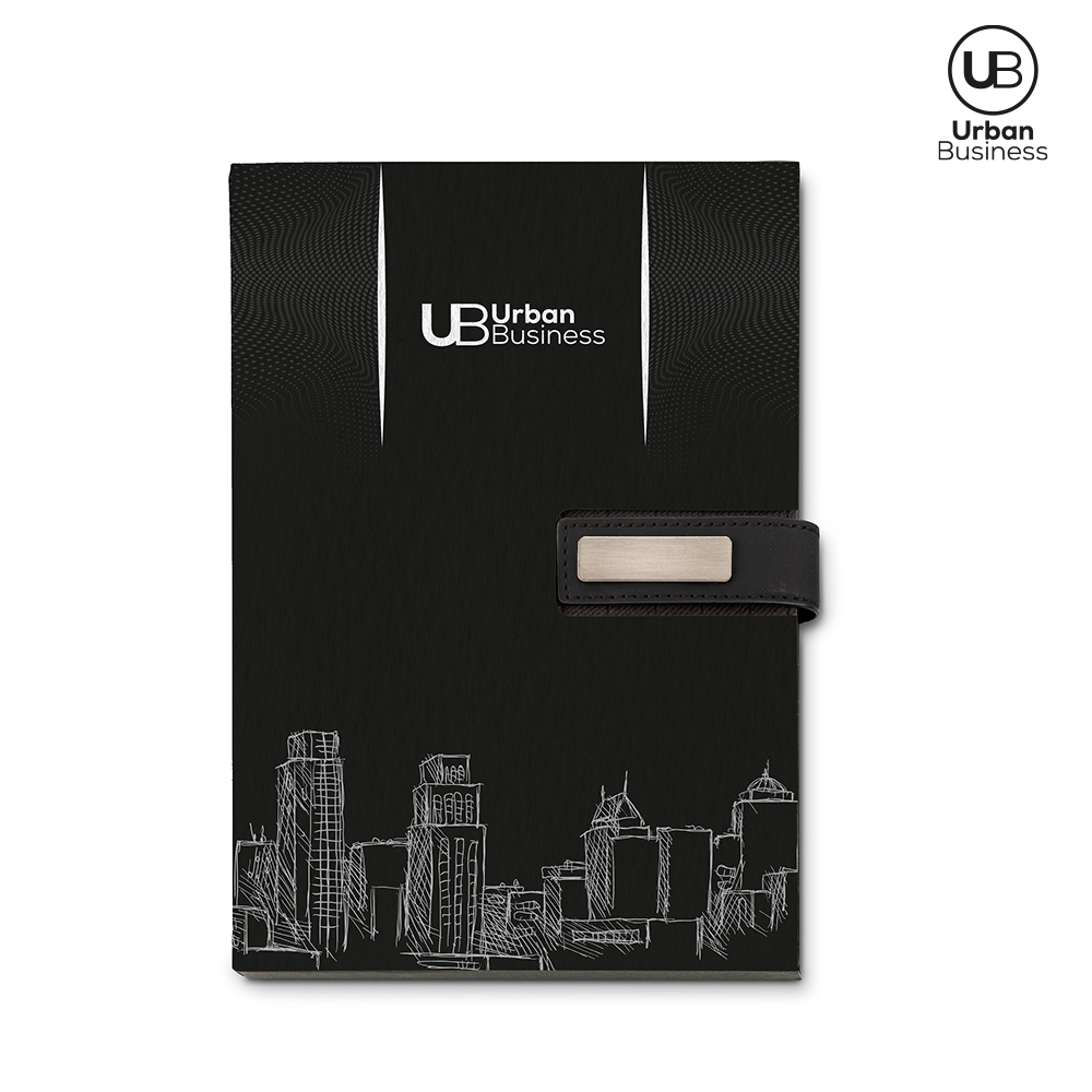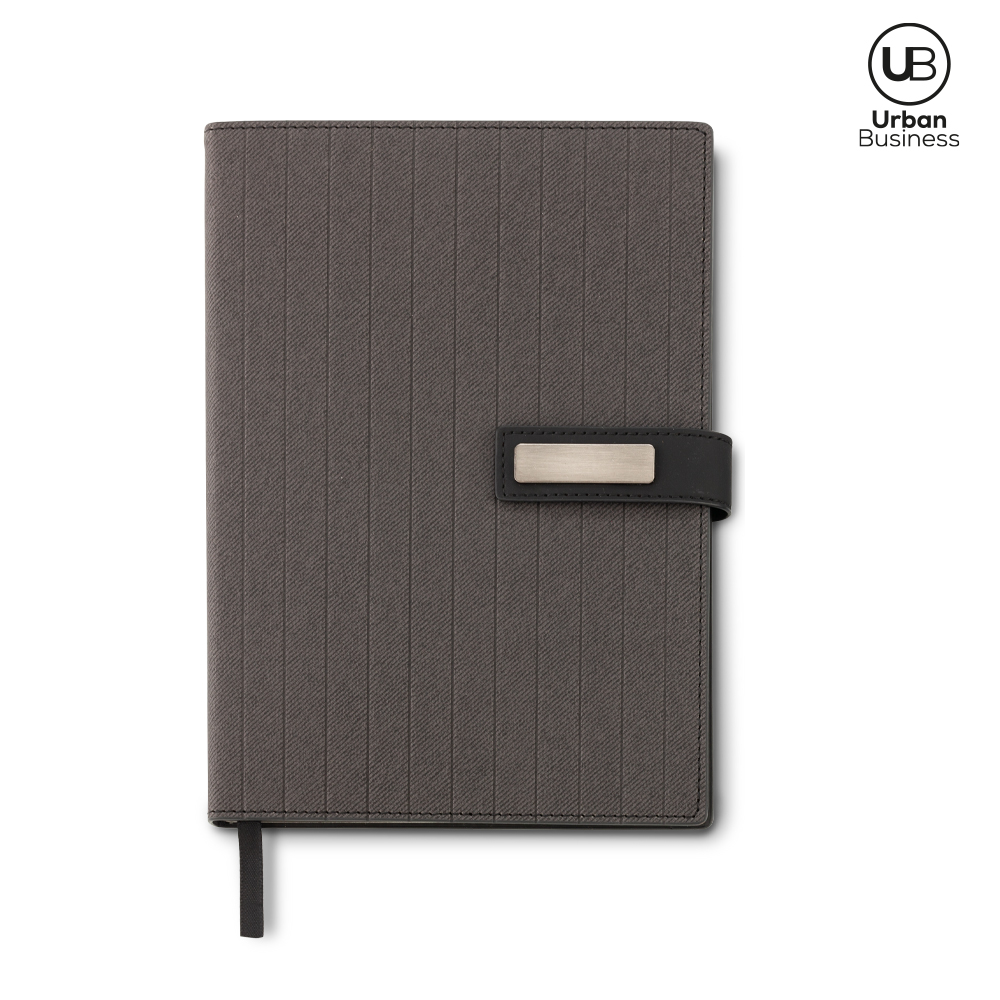 Libreta en poliuretano con cierre imán (tiene caja de presentación URBAN BUSINESS). 96 hojas rayadas. Incluye placa para marca. Empaque caja individual.