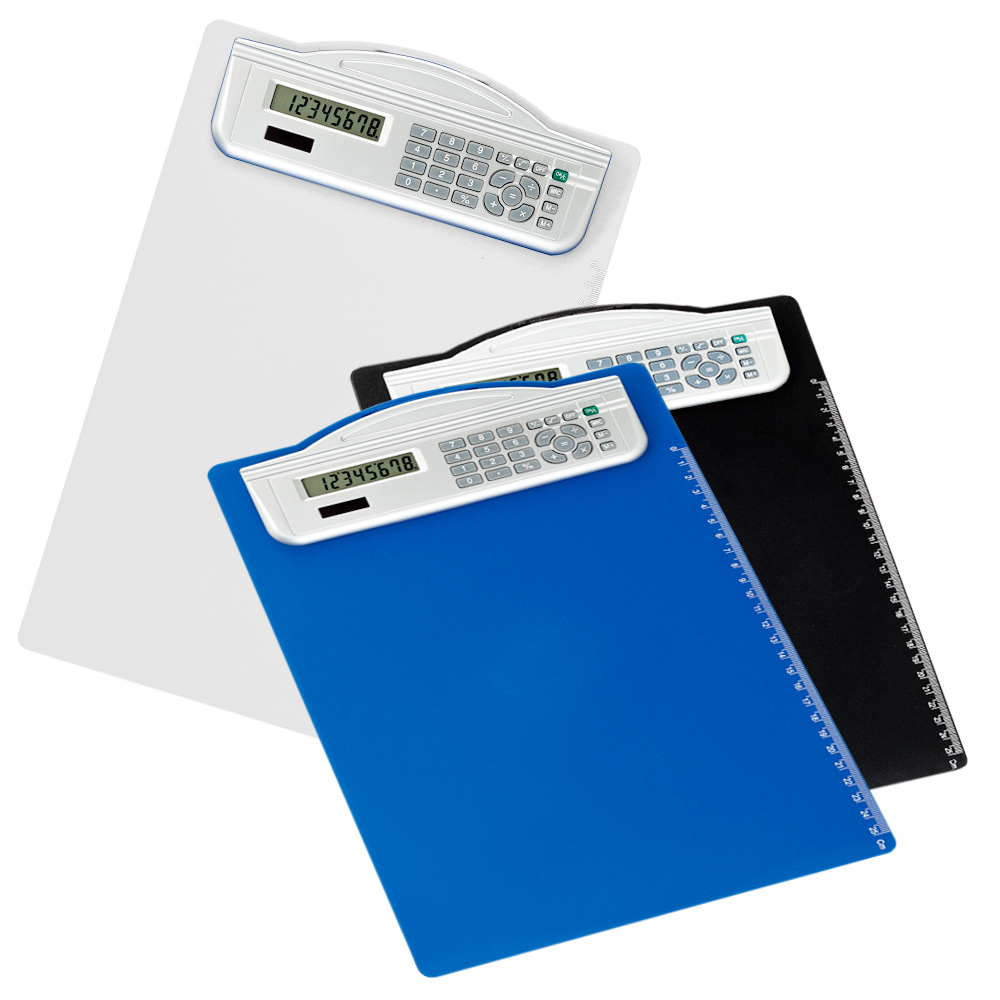 Tabla plástica para anotar. Con compartimiento para hojas y otro para bolígrafos. Con clip metálico.