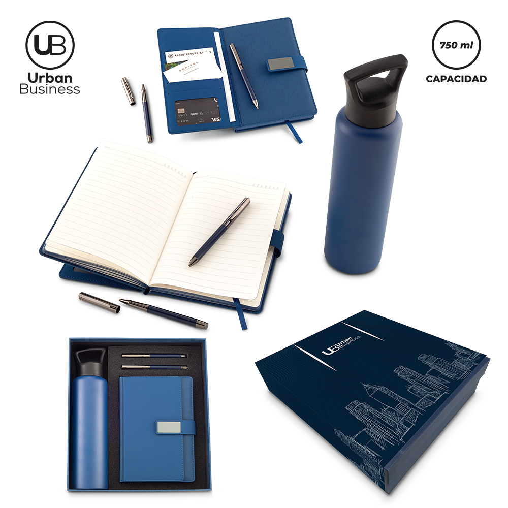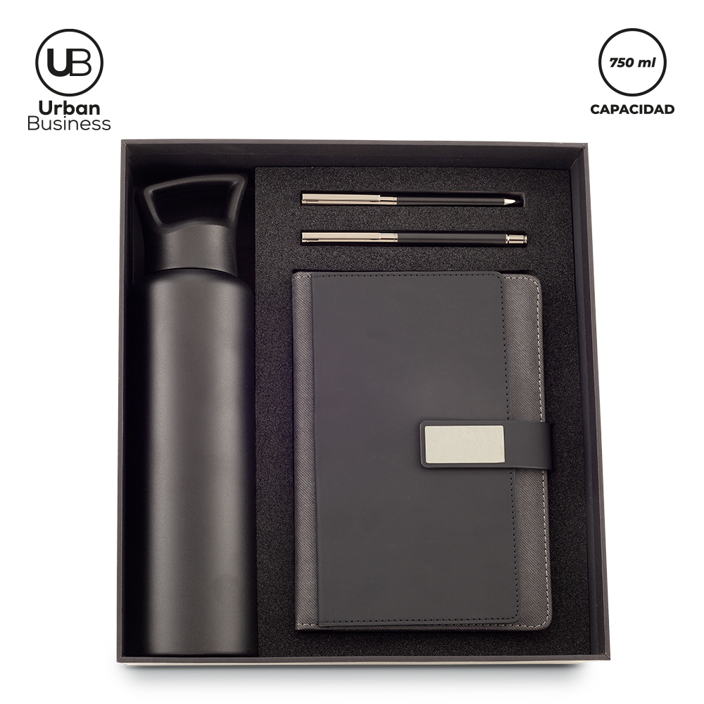 Set de libreta de 21 cm x 14.5 cm de 96 hojas rayadas. Cubierta en poliuretano, clip con imán y con porta documentos. Botilito de 750 ml doble pared en acero inoxidable. Un bolígrafo metálico con mecanismo twist y un bolígrafo metálico tipo roller. Empaque caja individual.