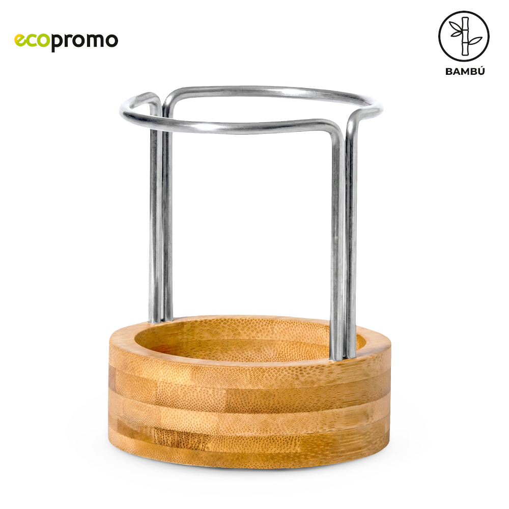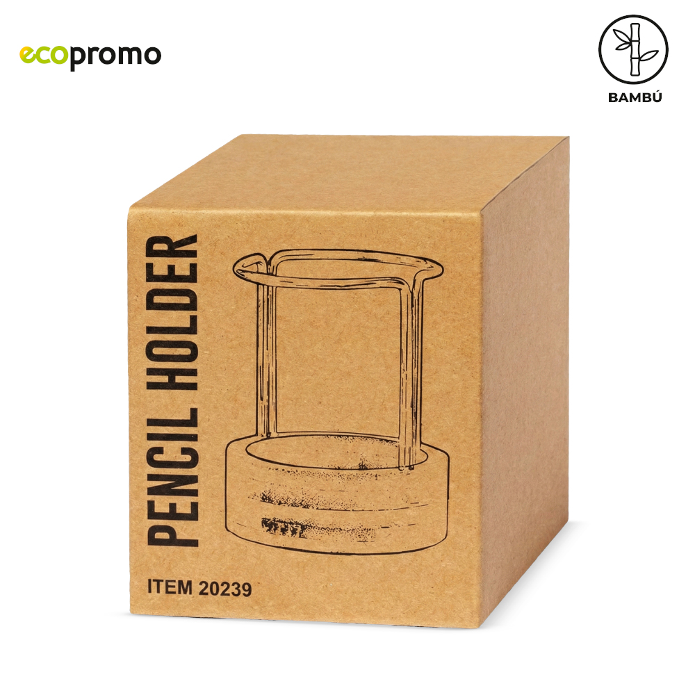 Portabolígrafos metálico con base en bambú. Empaque caja individual.