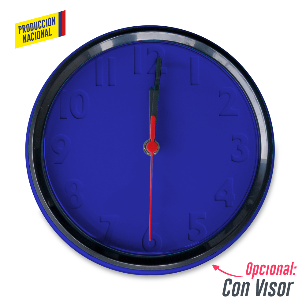 Reloj de pared con base en Poliestireno de Alto Impacto numeros en bajo relieve aro en ABS visor en poliestireno cristal Puede combinar la base y el aro en diferentes colores de linea Opcional con o sin visor Precio incluye mecanismo y manecillas negras RE-152 Empaque caja individual en cartulina blanca