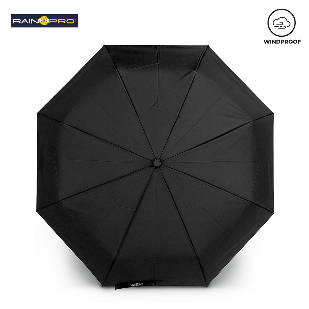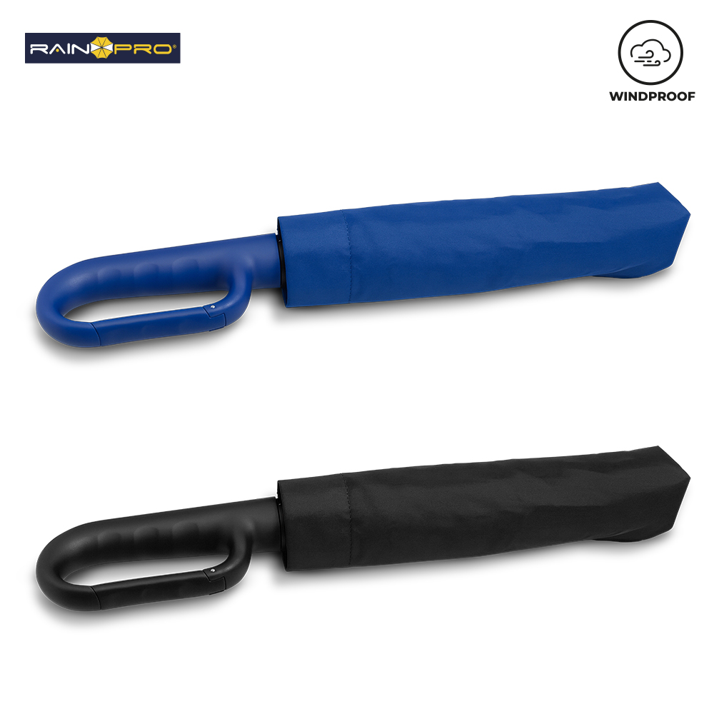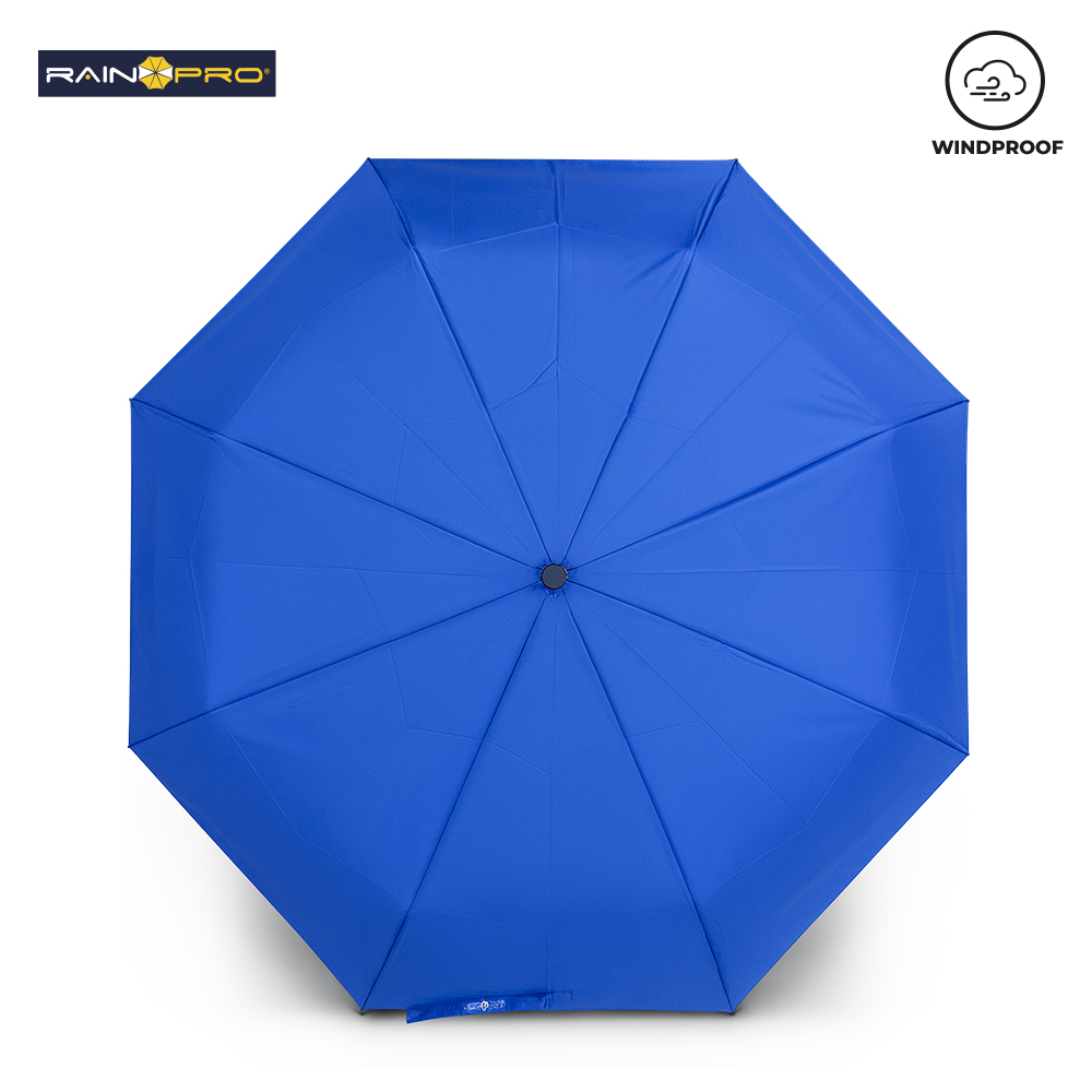 Paraguas plegable de alta calidad en poliéster Pongee 190T. Resistente al viento. Con herraje en aluminio y varillas en fibra de vidrio. Apertura y cierre automático con botón. 8 cascos. Mango tipo carabinero en plástico para poderlo colgar. Incluye funda.
