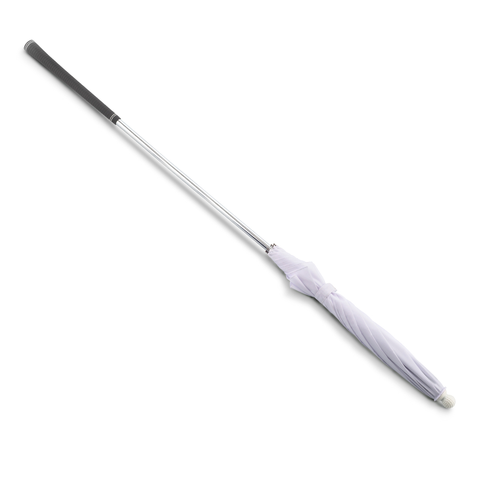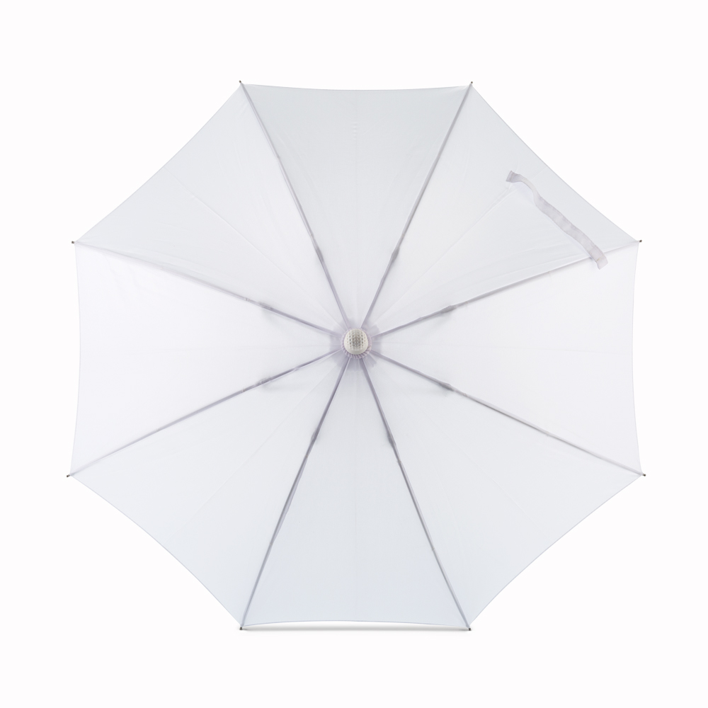 Paraguas en poliéster pongee 19OT de apertura y cierre manual, que sirve para mantener el carrito de golf protegido y seco. Cubre completamente los palos y deja los bolsillos accesibles. Mango extensible y cascos flexibles manualmente. Herraje Metálico. (Resorte no se bloquea).