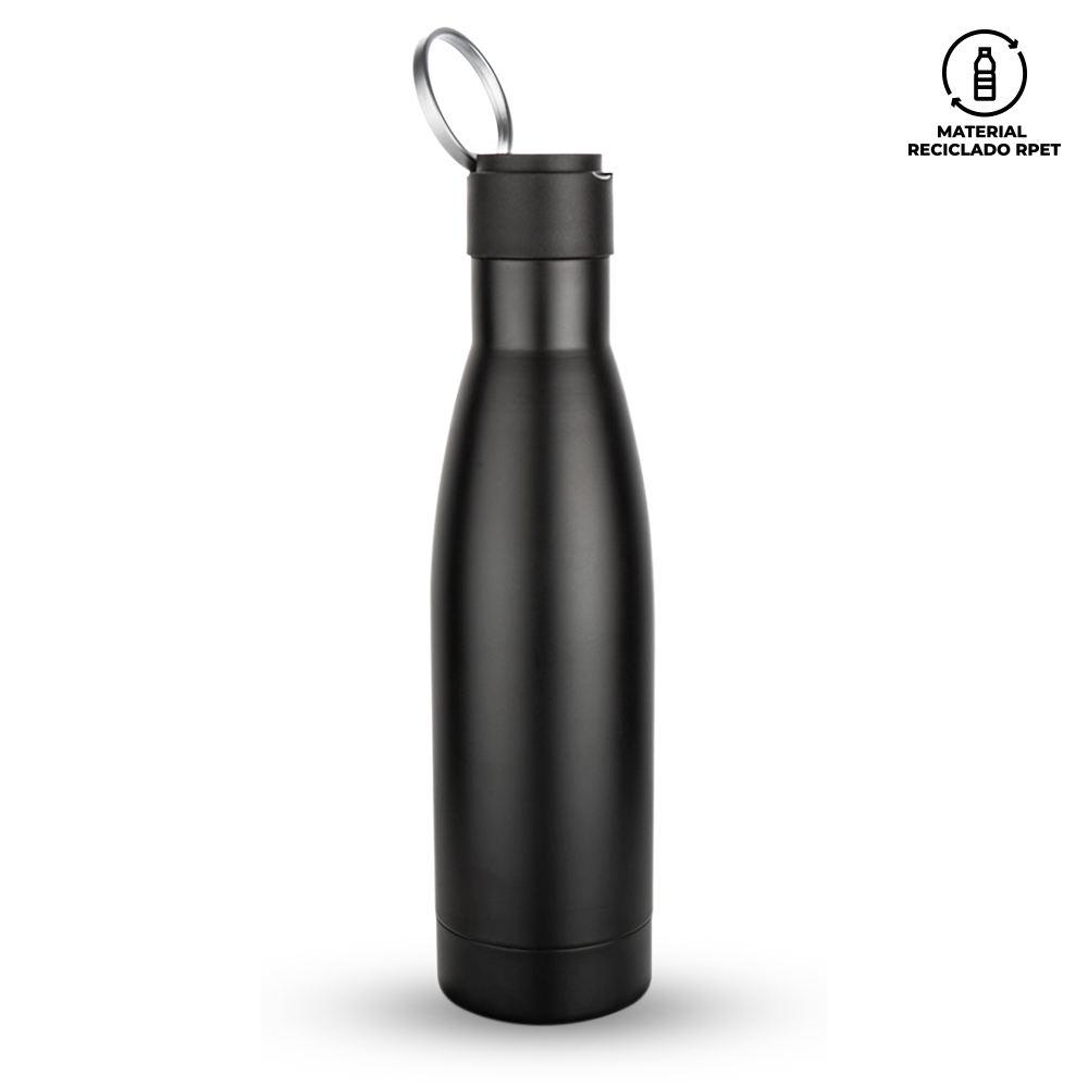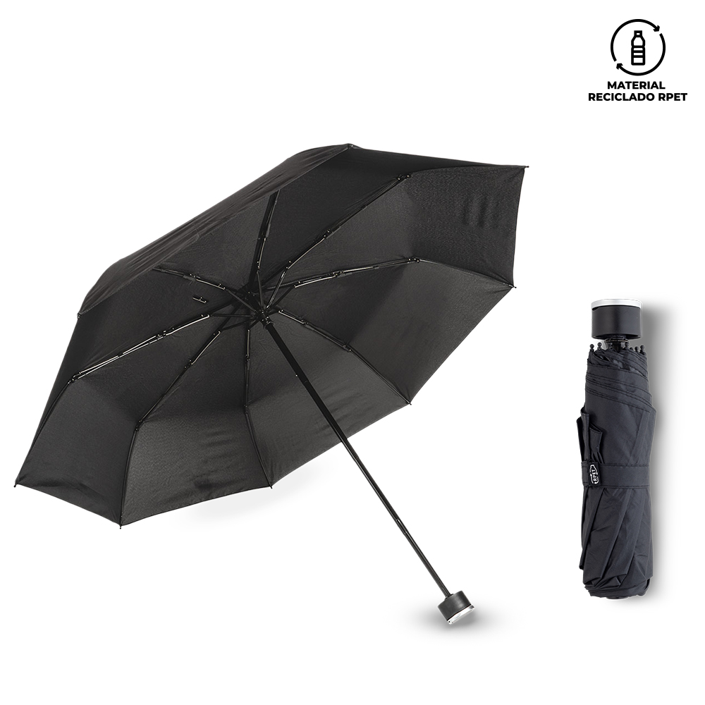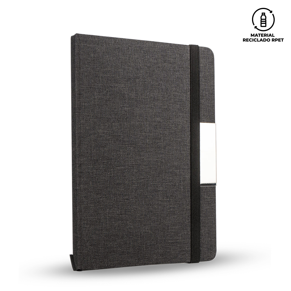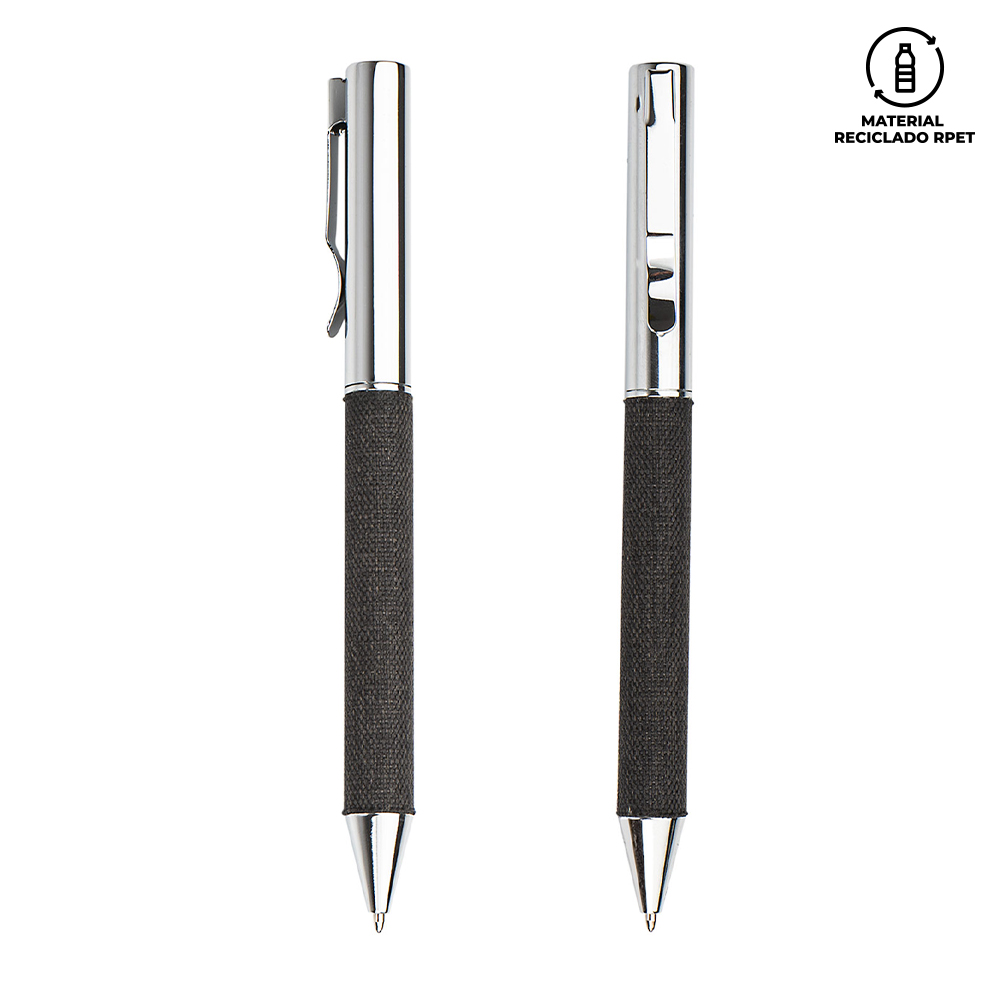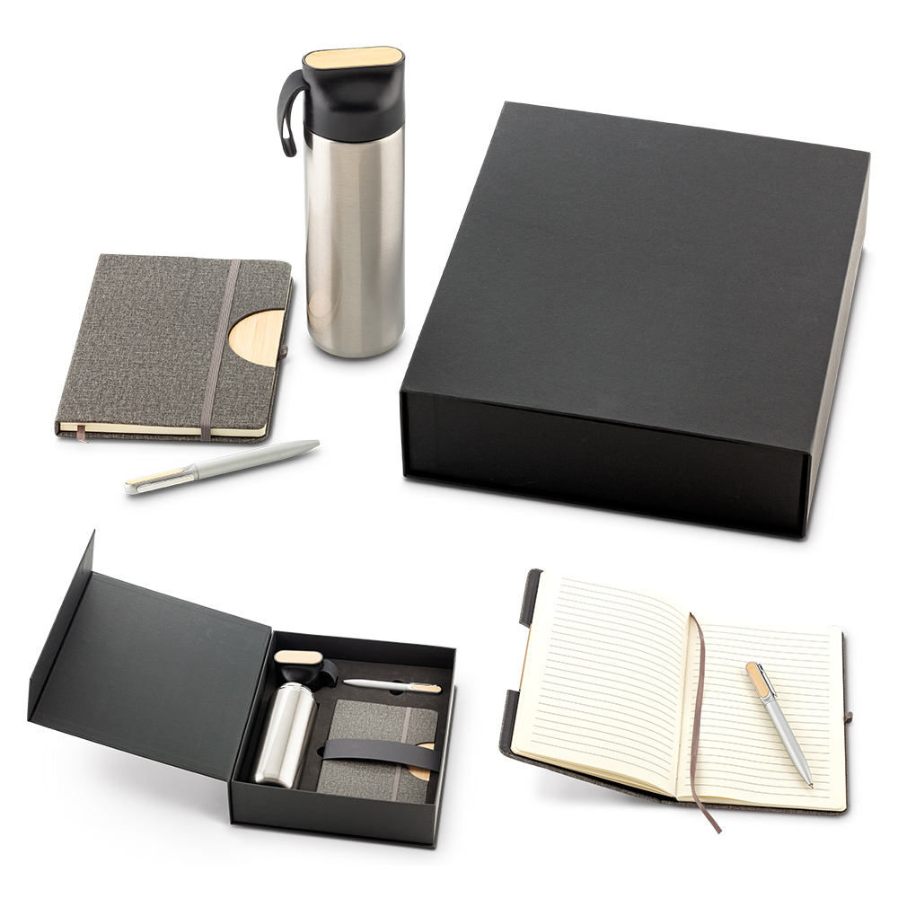 Set en estuche de lujo que incluye boligrafo en aluminio con cubierta RPET y sistema twist libreta con cubierta RPET con 80 hojas rayadas banda elastica de cierre lateral cinta separadora y portaboligrafo Adicionalmente un mini paraguas de tela 190t Pongee y un botilito de 600ml doble pared en acero inoxidable con tapa de rosca y aro metalico Empaque caja individual