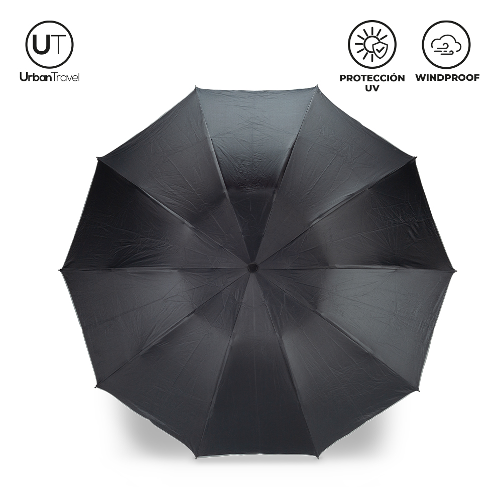 Paraguas plegable en poliéster pongee 210T. Apertura y cierre automático. Herraje metálico y fibra de vidrio. Sistema antibrisa y protección UV (UPF40+). Con forro para cargar. Mango plástico con luz LED de 2 modos diferentes. 10 cascos. Borde reflectivo.