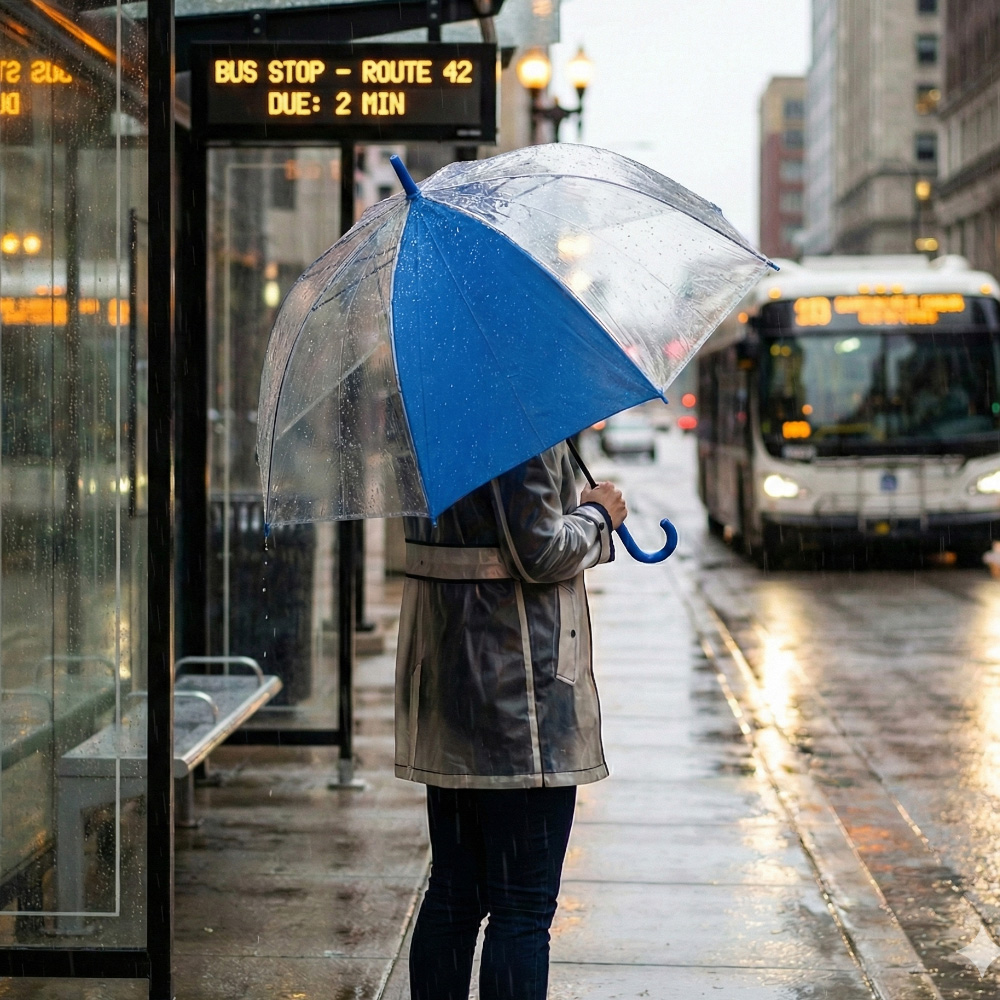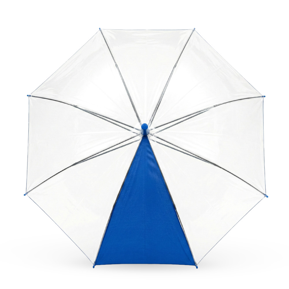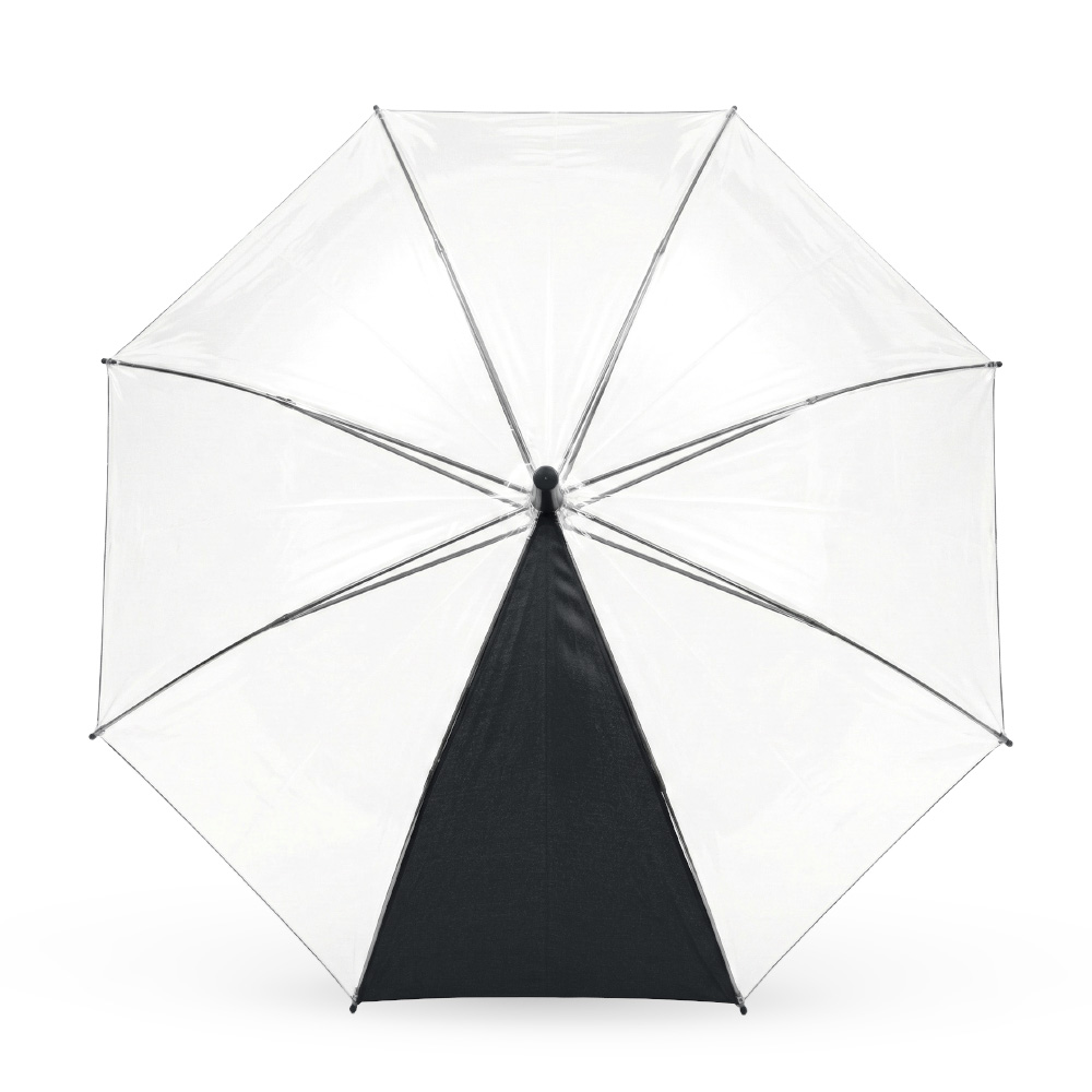 Un panel en poliéster pongee y siete paneles en plástico POE. Paraguas con mayor cobertura y visibilidad al caminar. Apertura y cierre manual. Mango curvo en caucho y herraje metálico con fibra de vidrio.