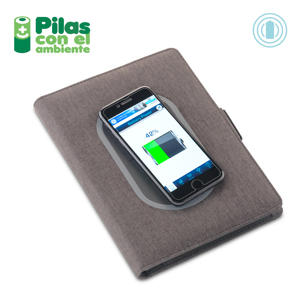 Cargador inalambrico con folder anotador y pila recargable de 5000 mAh con cable mini USB para cargar la pila Con bolsillo portacelular interno No incluye boligrafo Use el cable de su movil para cargarlo Empaque Caja Individual Input : 5V 1A Output (Inalambrica) : 5V 1A 5W / Output (Cable) : 5V 2 1A