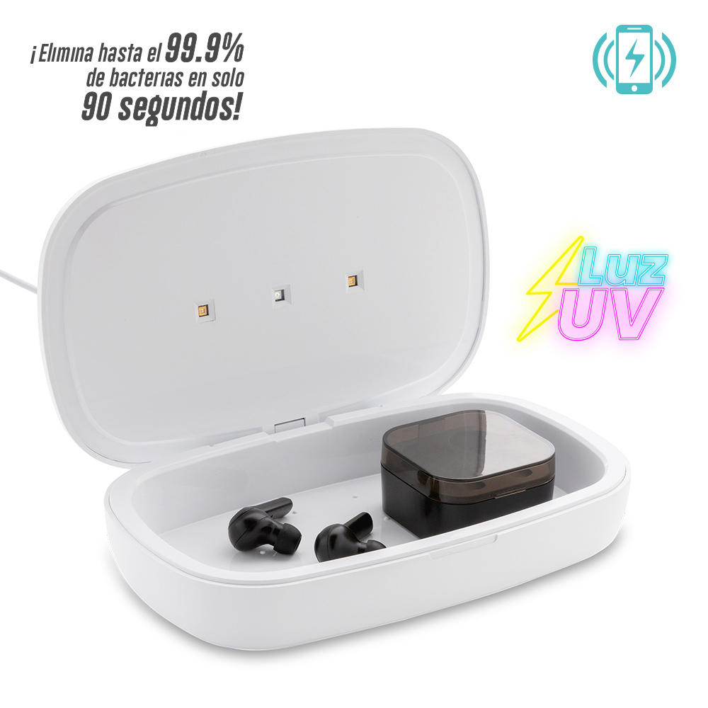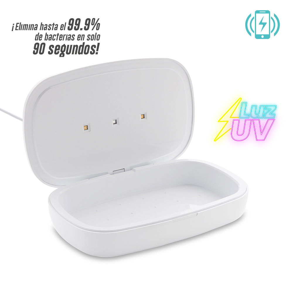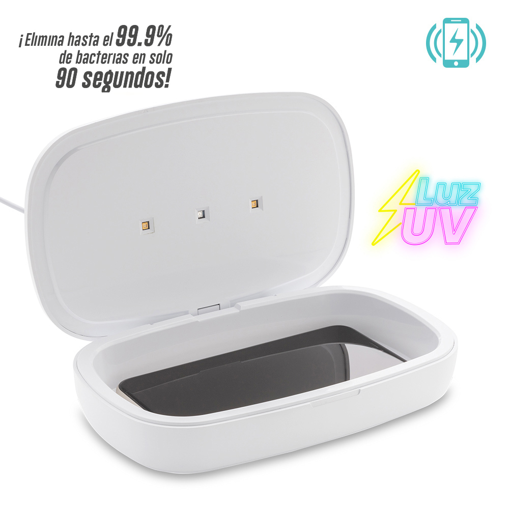 Producto multifuncional de alta tecnologia apto para telefonos celulares de 4 7 a 6 pulgadas Al mismo tiempo tambien es adecuado para una variedad de productos como auriculares Bluetooth tapones para los oidos relojes inteligentes dispositivos electronicos etc Capacidad interna 18cm x 10 5cm x 2 5cm Es un producto que consume poca energia y ambientalmente amigable La luz UV LED solo funciona con el dispositivo completamente cerrado La funcion de carga inalambrica se realiza colocando el smartphone sobre la tapa del esterilizador