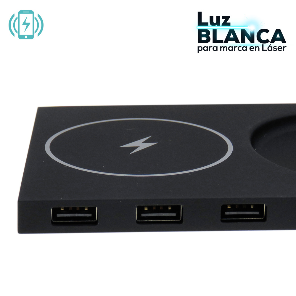 Cargador inalambrico plastico Con bandeja organizadora para escritorio que tiene un area con luz que ilumina el logo al marcar en laser 3 puertos USB Empaque Caja Individual Salida: 5V / 2A Entrada: 5V / 2APotencia: 5 W