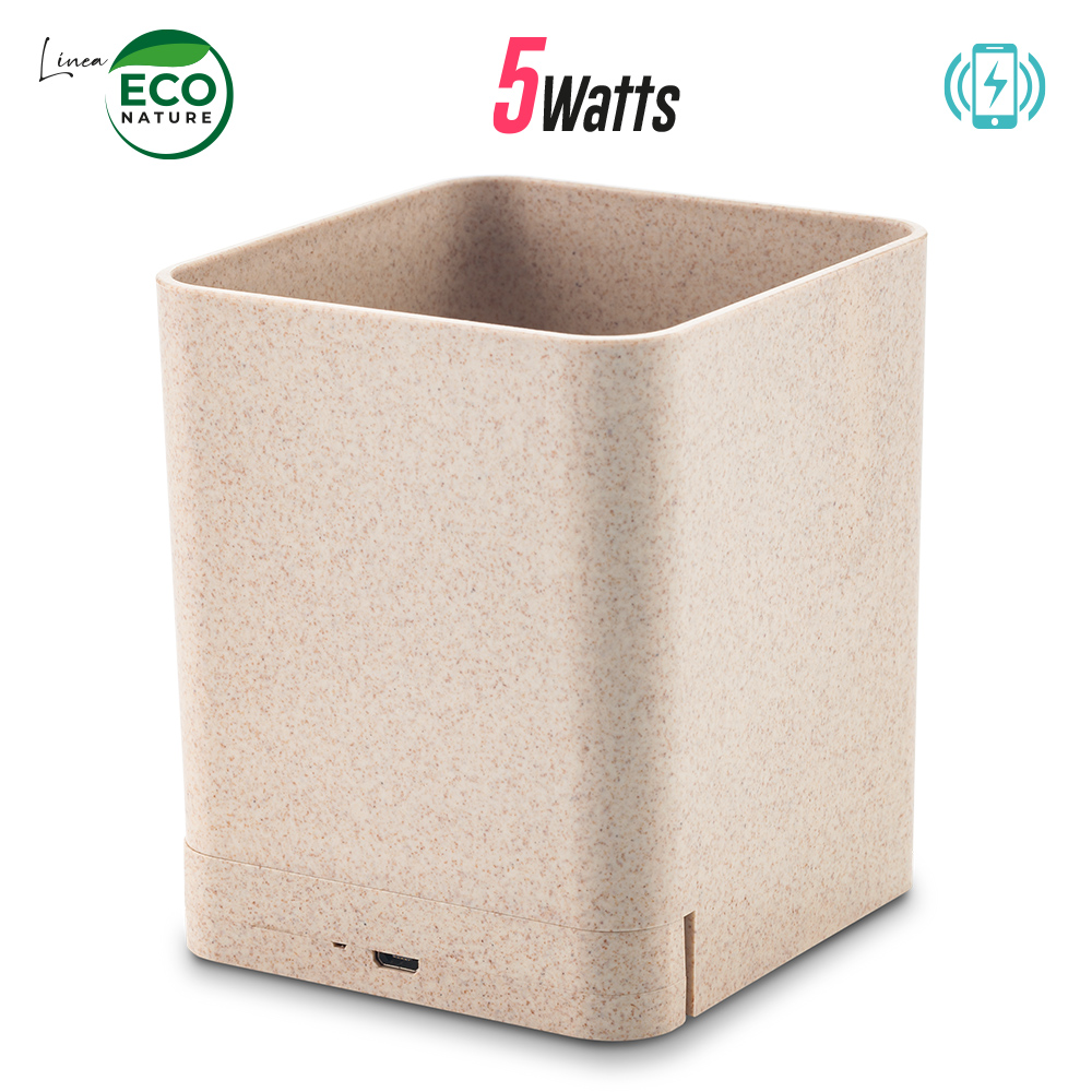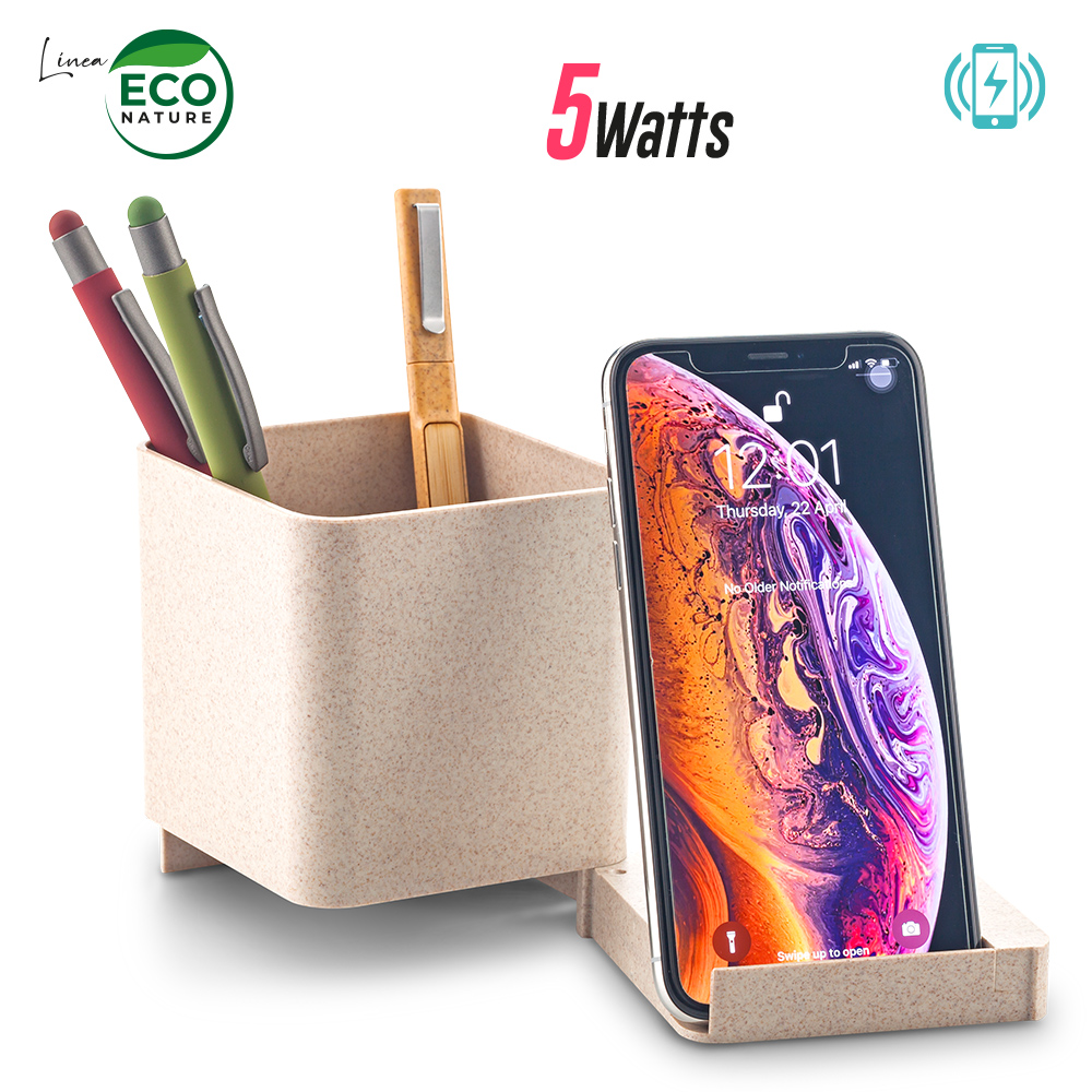 Cargador inalambrico de 5W en la base plastico con material ecologico de fibra de trigo portaboligrafos y 3 salidas USB (aptos para carga y para transmision de datos cuando se usa con el cable que esta incluido) Empaque caja individual