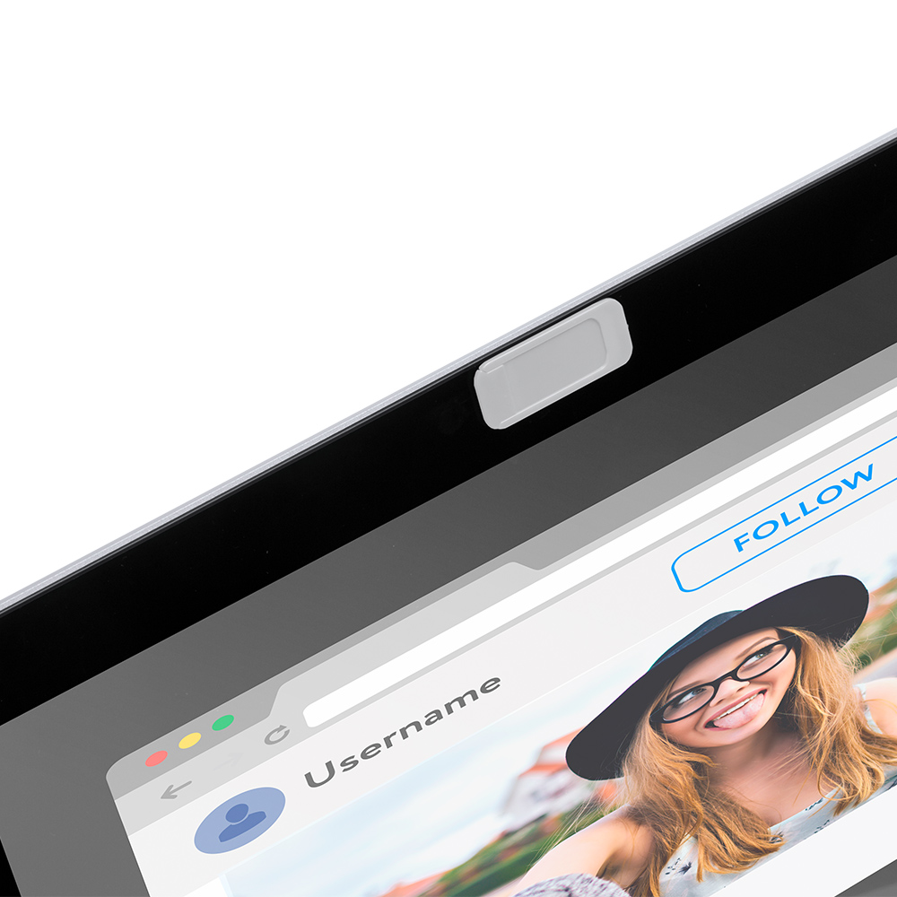 Tapa deslizante adhesiva en plastico para cubrir la camara frontal de la laptop Debe limpiar muy bien la superficie que debe ser lisa y despues de pegar sostener por un minuto aprox para que quede fijo