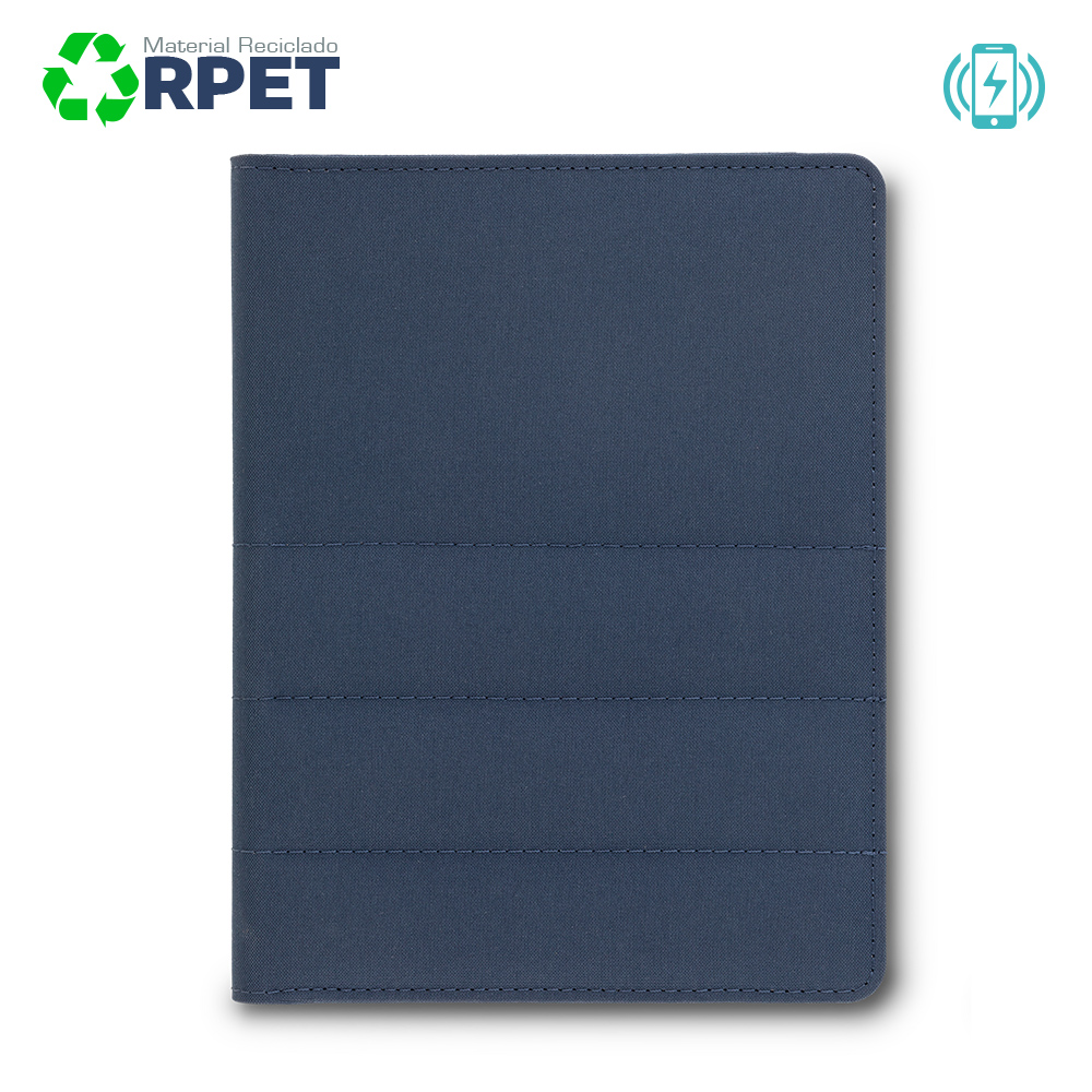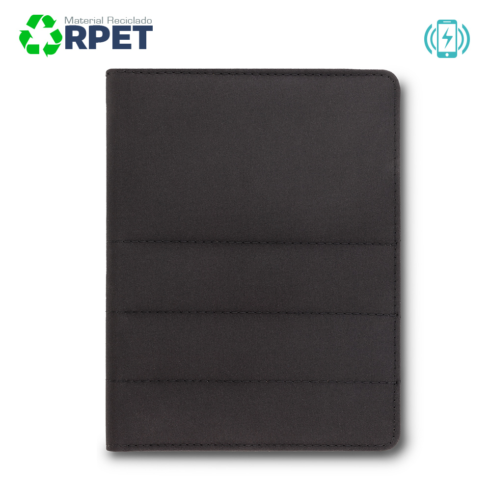 Libreta tamano A5 de 60 hojas papel crema con rayas con funda multifuncional elaborada en poliester reciclado hecho a partir de la reutilizacion de botellas plasticas un bolsillo portatarjetas y bloc de notas Incluye cargador inalambrico de 5W (funciona siempre conectado) no incluye boligrafo