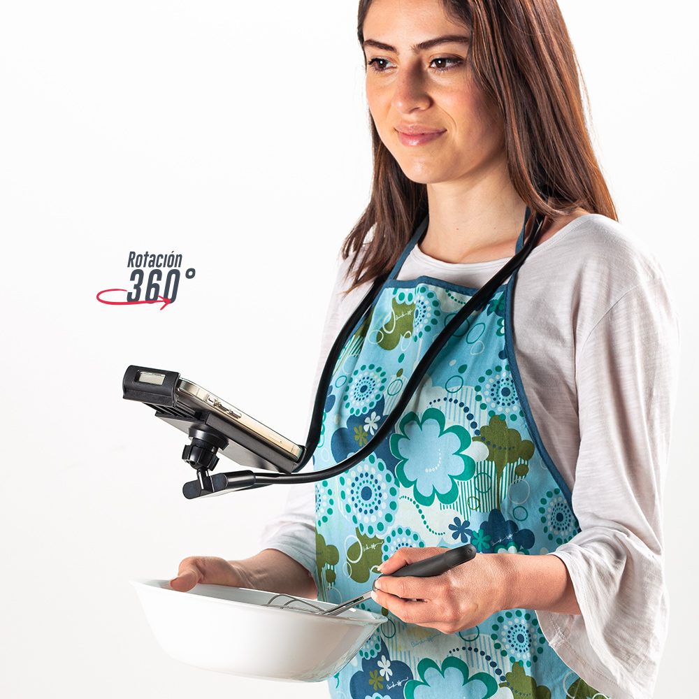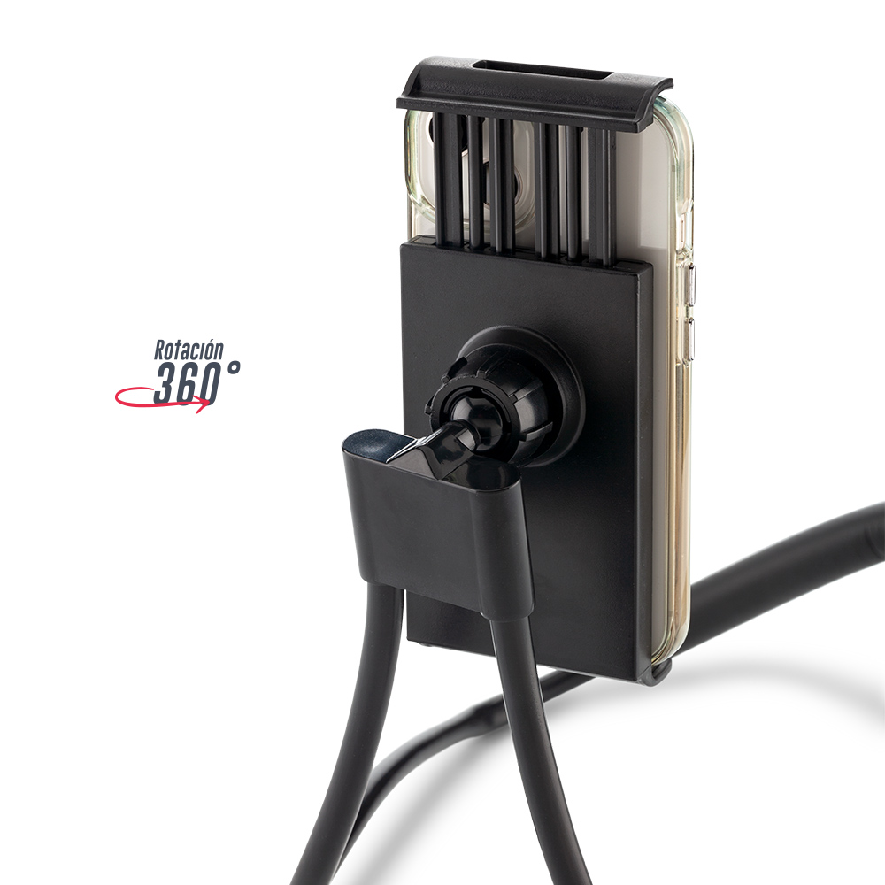 Soporte plastico flexible para moviles Altura ajustable con espuma suave para mas comodidad Permite rotacion de 360 Empaque caja individual