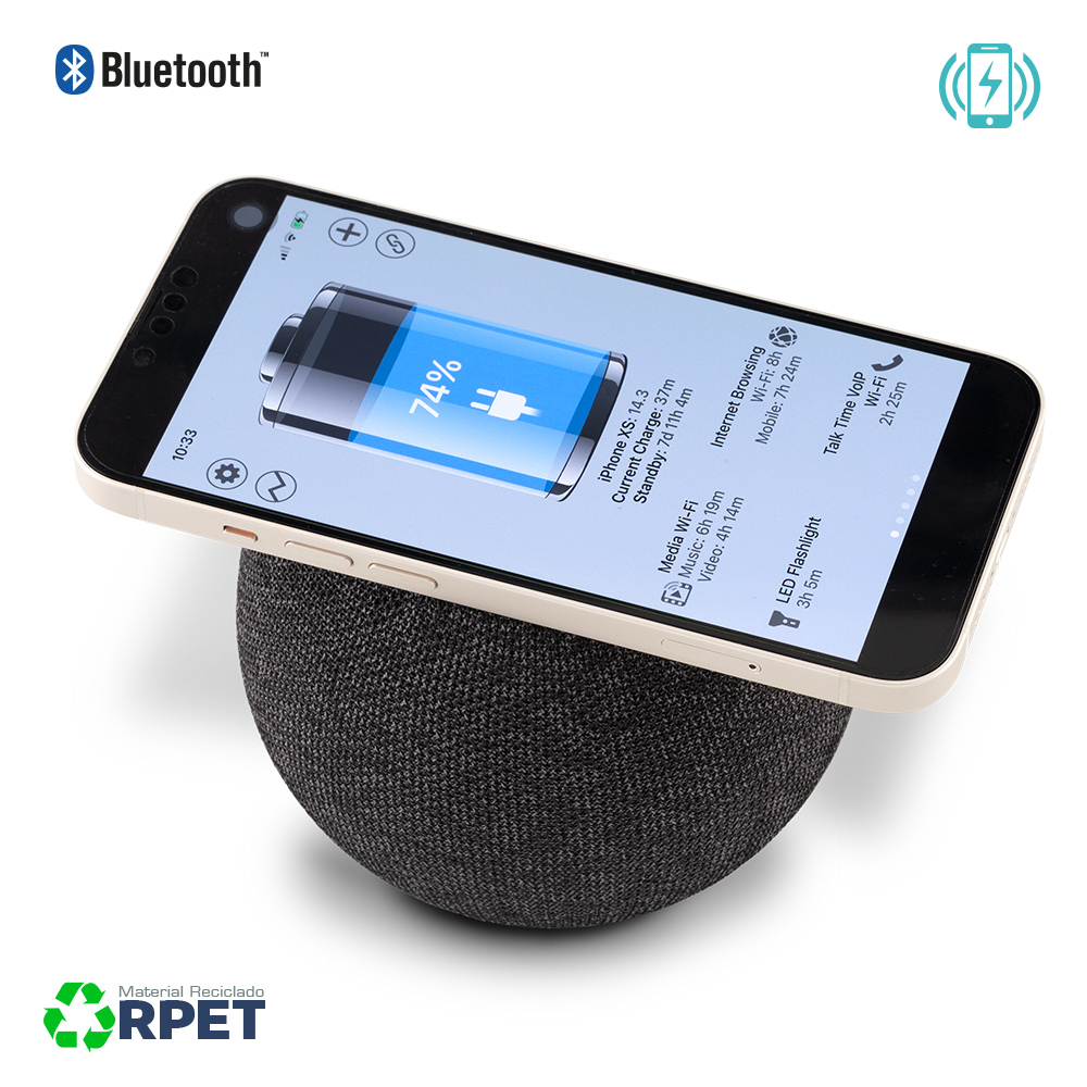 Speaker Bluetooth de 5W con cargador inalambrico de 15W en poliester reciclado RPET y bambu Compatible con dispositivos equipados con tecnologia de carga inalambrica Bateria incorporada de 1200mAh Base antideslizante Empaque caja individual