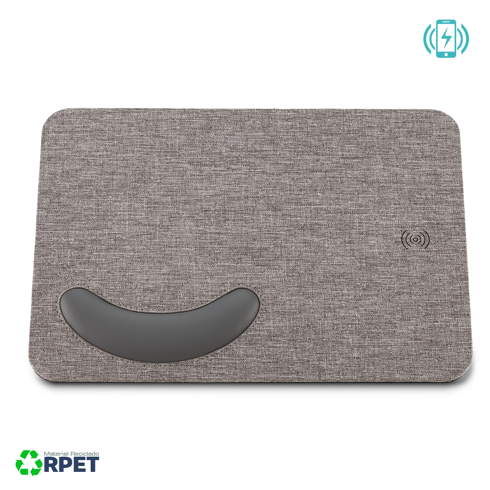 Cargador inalambrico para moviles en poliester reciclado RPET con mouse pad y apoya munecas ergonomico acolchado