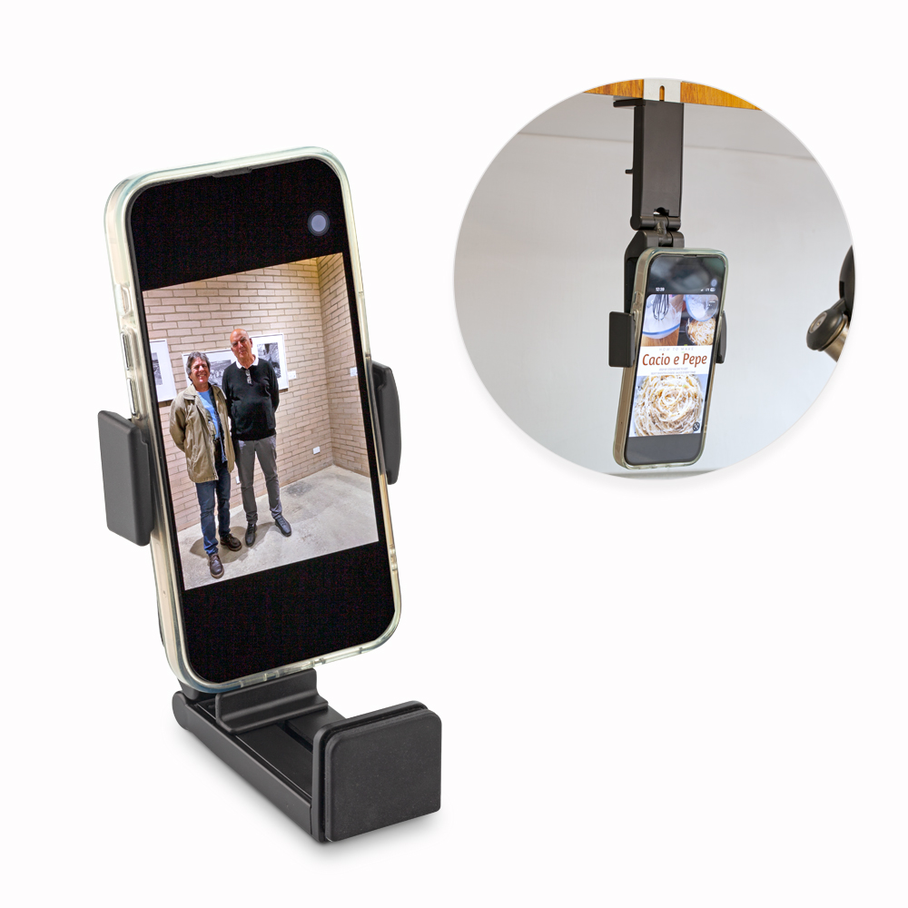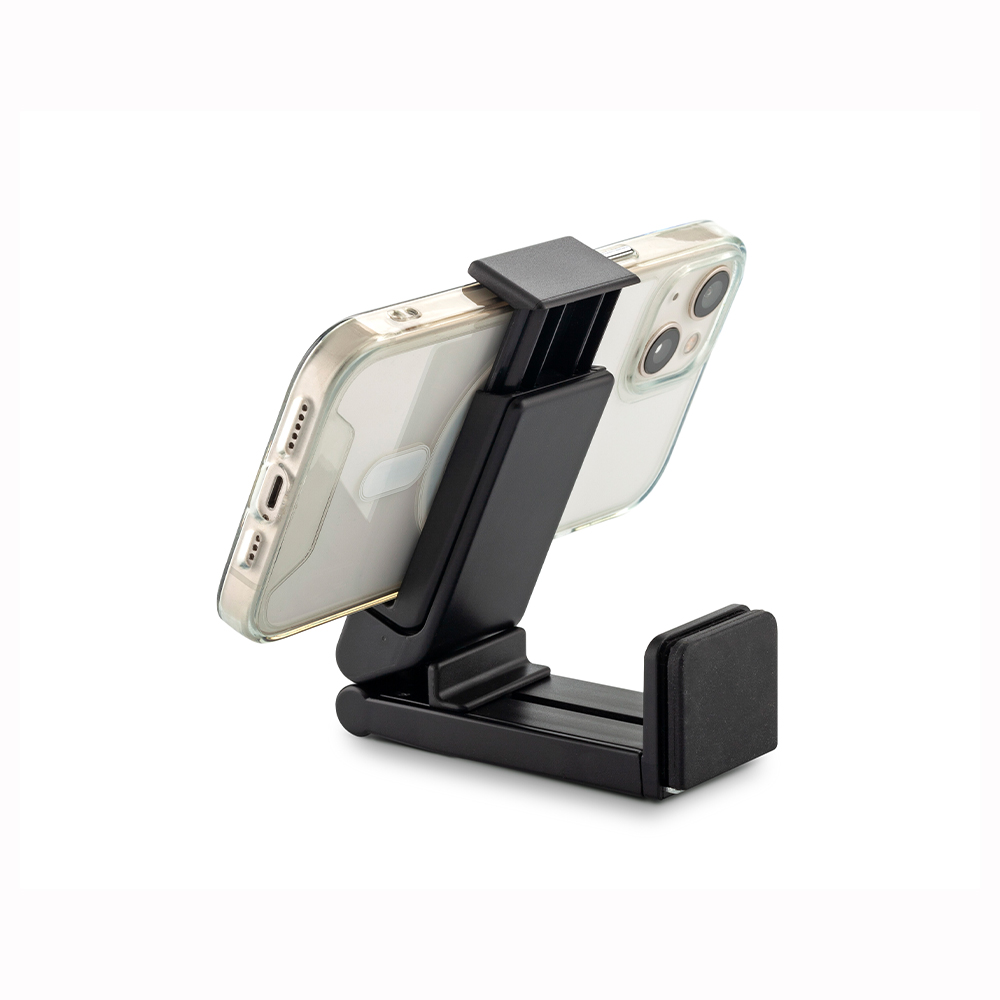 Soporte en plástico para móviles, plegable y escualizable, rotación 360°. Empaque caja individual.