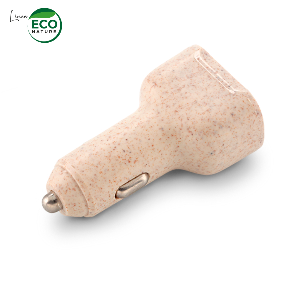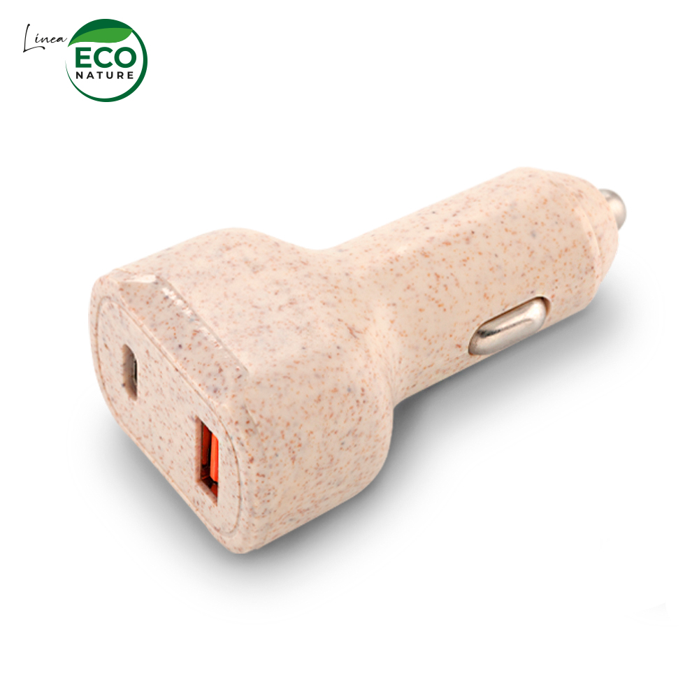 Cargador ecológico en fibra de trigo para carro. Incluye puerto Tipo C y Tipo USB. Empaque caja individual.