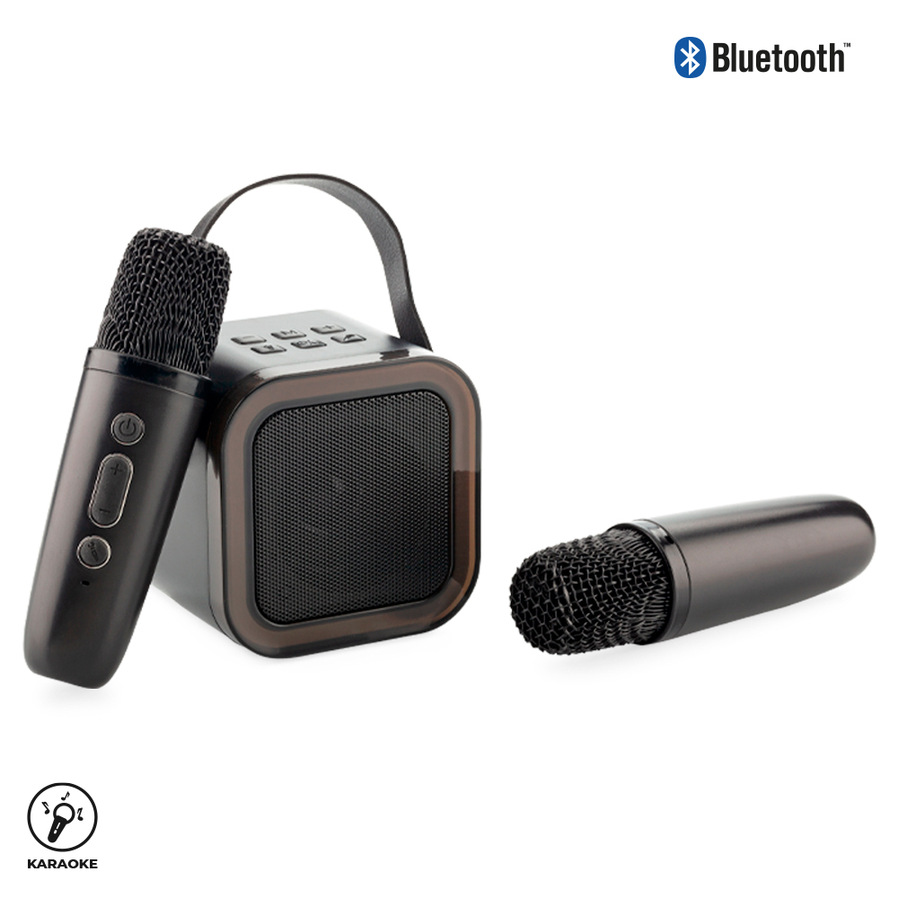 Speaker Bluetooth Karaoke plástico de 6w. Batería incorporada de 800mAh. Con luz multicolor, entradas USB, Tipo C y tarjeta SD (no incluida). Conexión para audífonos. Con manija en imitación cuero para cargar. Incluye micrófono inalámbrico con carga por cable Tipo C. Empaja caja individual.