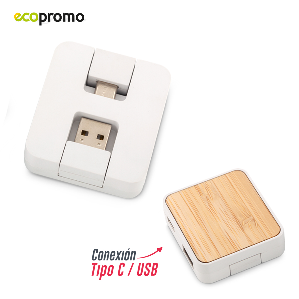 Puerto USB plástico y bambú con doble conexión Tipo C y USB. Dos puertos USB y dos Tipo C. Empaque caja individual.