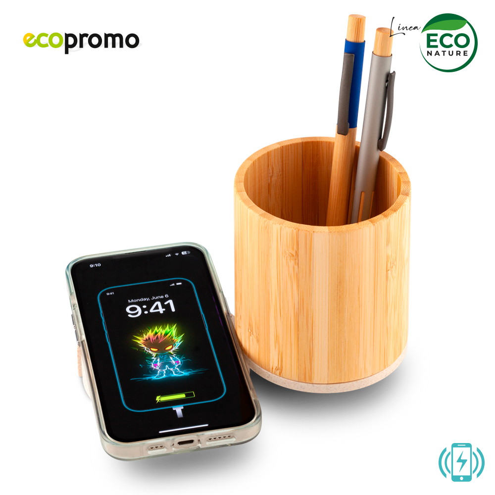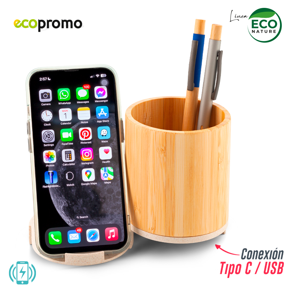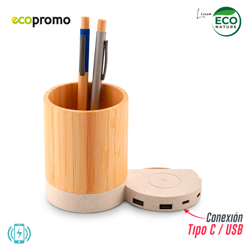 Cargador inalámbrico en fibra de trigo de 5W con portabolígrafos en bambú. Dos puertos USB y dos Tipo C. Incluye cable Tipo C para carga. Empaque caja individual.