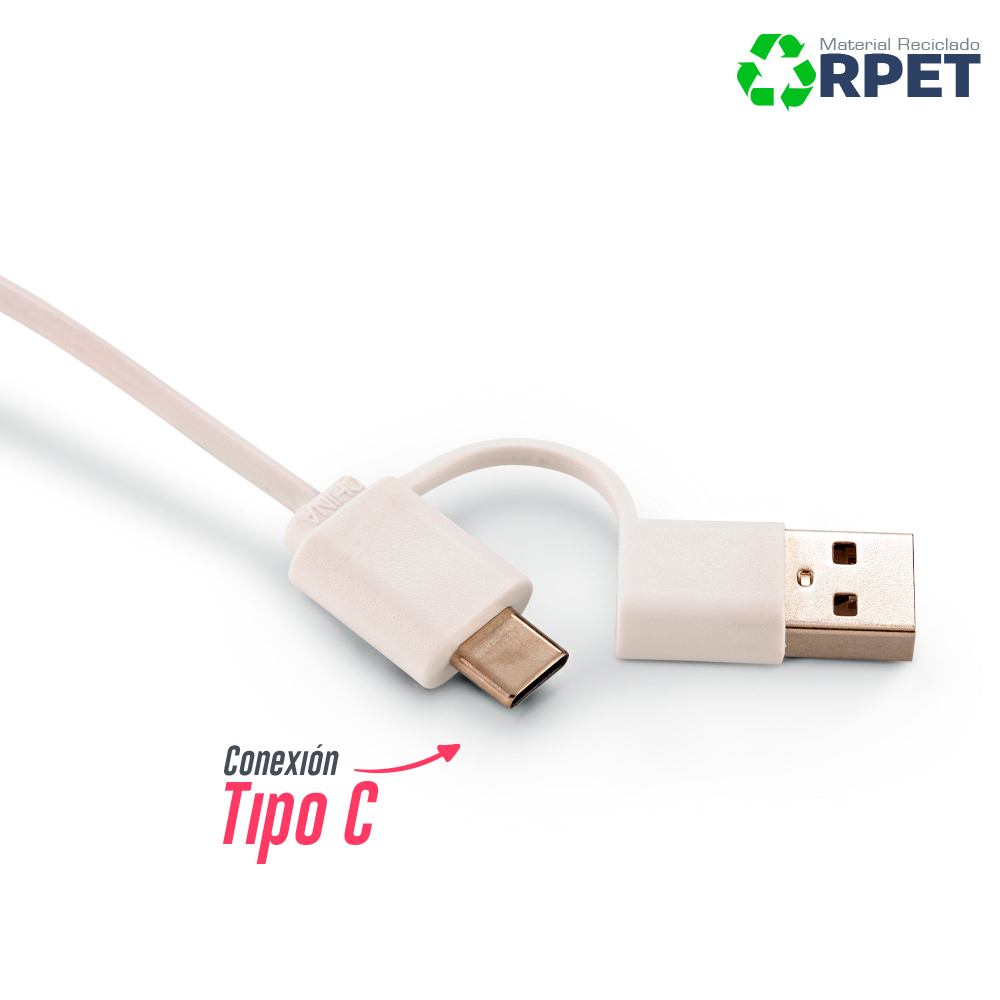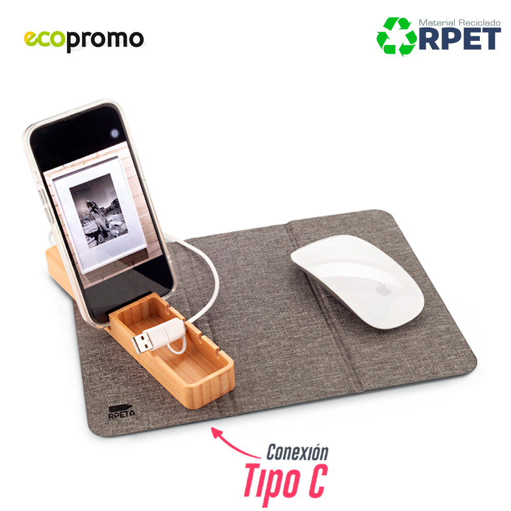 Mouse pad en poliéster reciclado RPET con organizador en bambú. Dos puertos Tipo USB, un puerto Tipo C. Cable Tipo USB y Tipo C. Con soporte para celular y organizador de cables. Empaque caja individual.