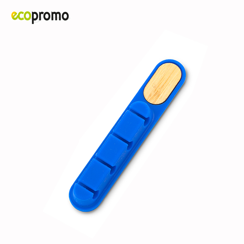 Organizador de cables en silicona. Con placa en bambú para marca.