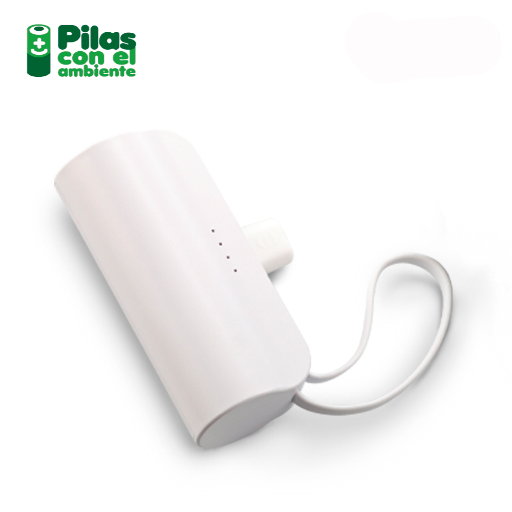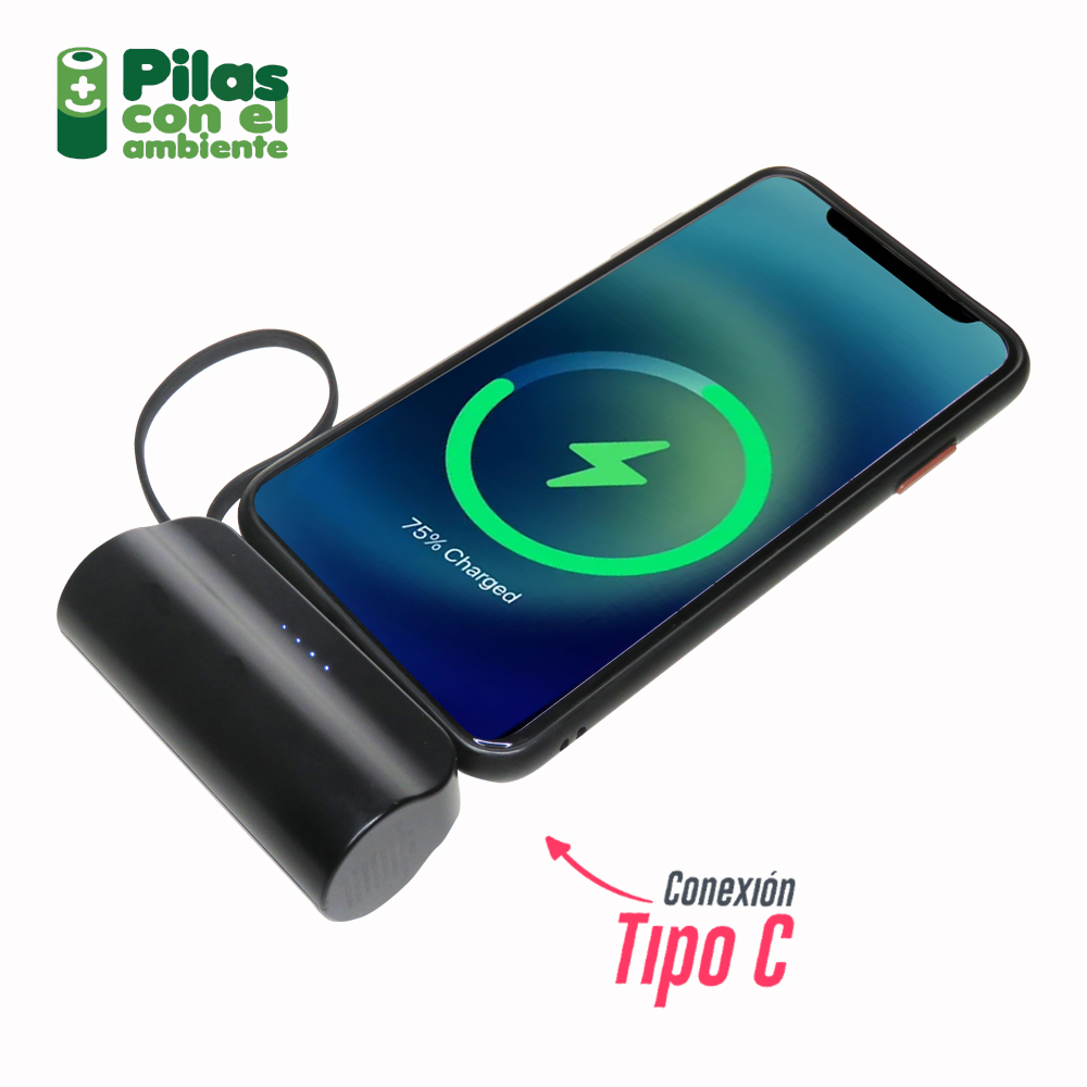Pila plástica recargable de 5000 mAh. Cable con conector Tipo C, conector 2-1 (lighting-Micro). Incluye cable Tipo C para cargar la batería.