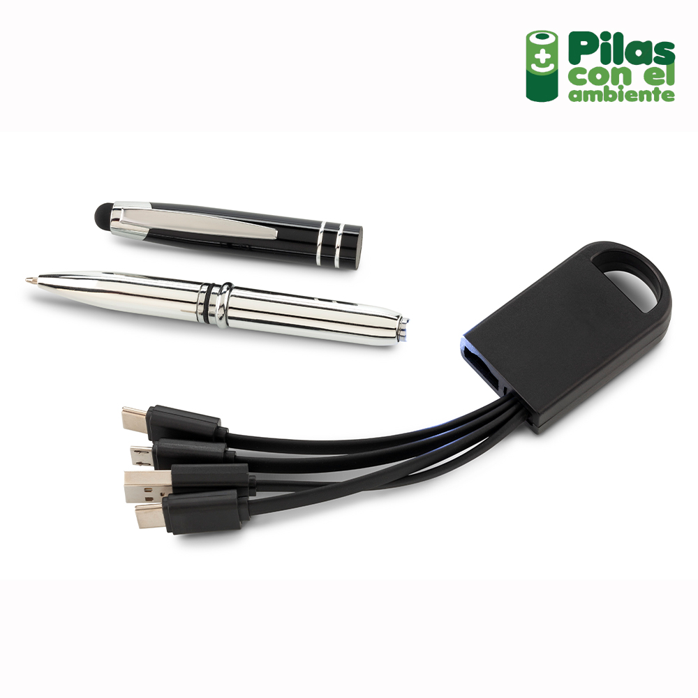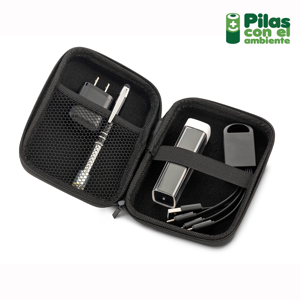 Set multifunción para viaje. Incluye una pila recargable de 2200 mAh para teléfonos móviles, un cable muticargador con conectores 2-1 (micro y lighting), Tipo C y Tipo USB, un bolígrafo roller plástico con stylus y un Cargador Tipo USB. Estuche rígido en poliuretano.