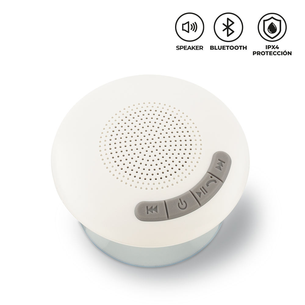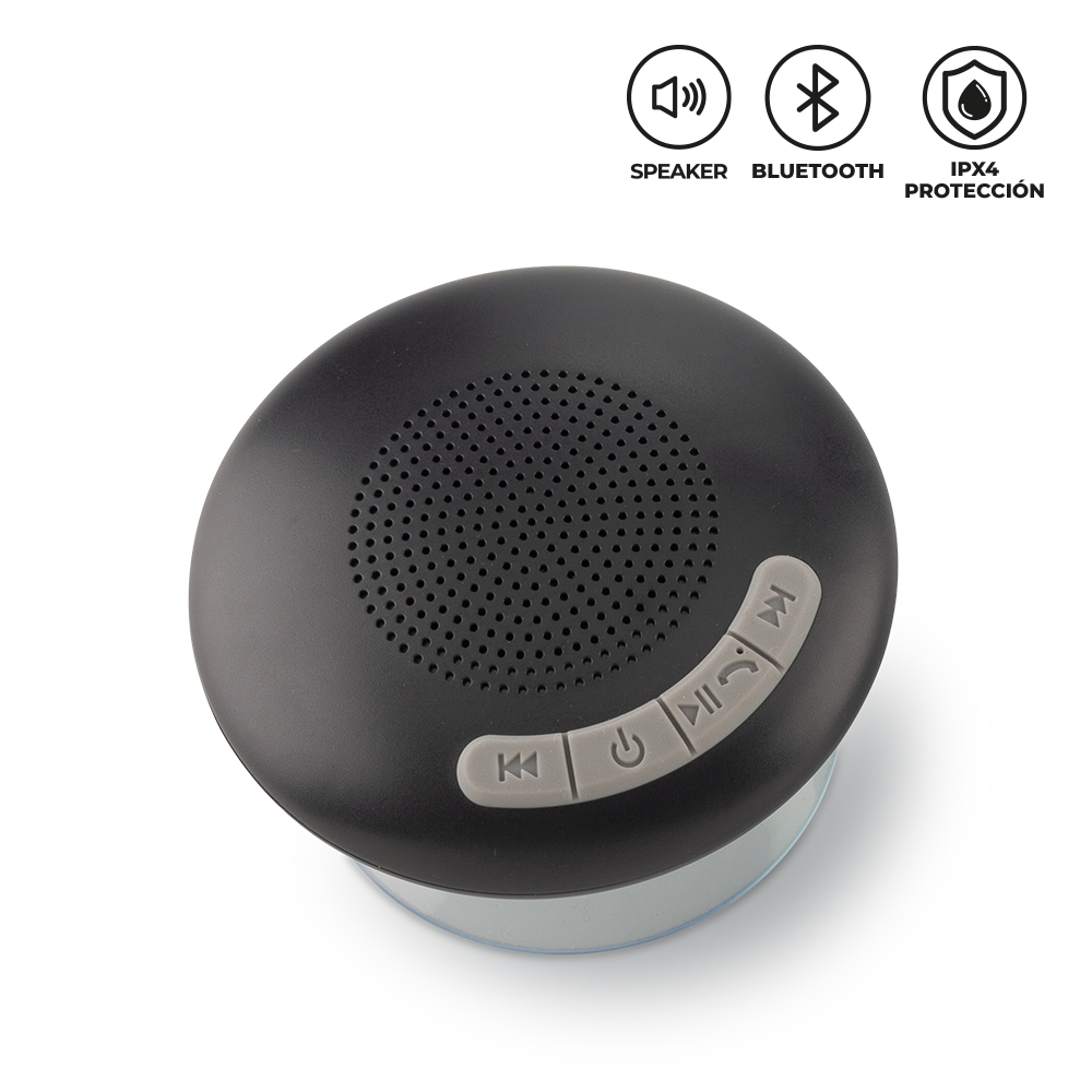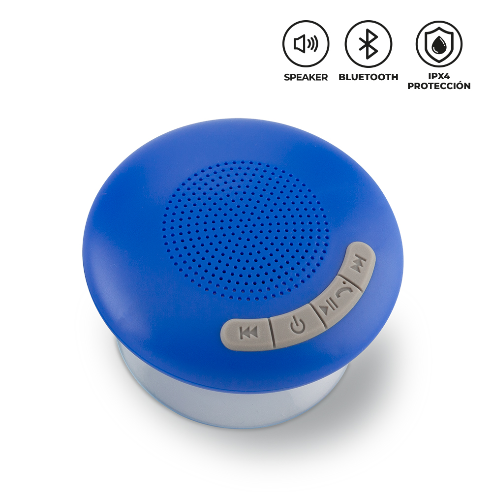 Speaker Bluetooth plástico con chupa, resistente al agua, de 3W. Capacidad de la batería de 300mAh. Tiempo de funcionamiento 2 horas aproximadamente. Rango de conexión de 10 mt. Empaque caja individual.