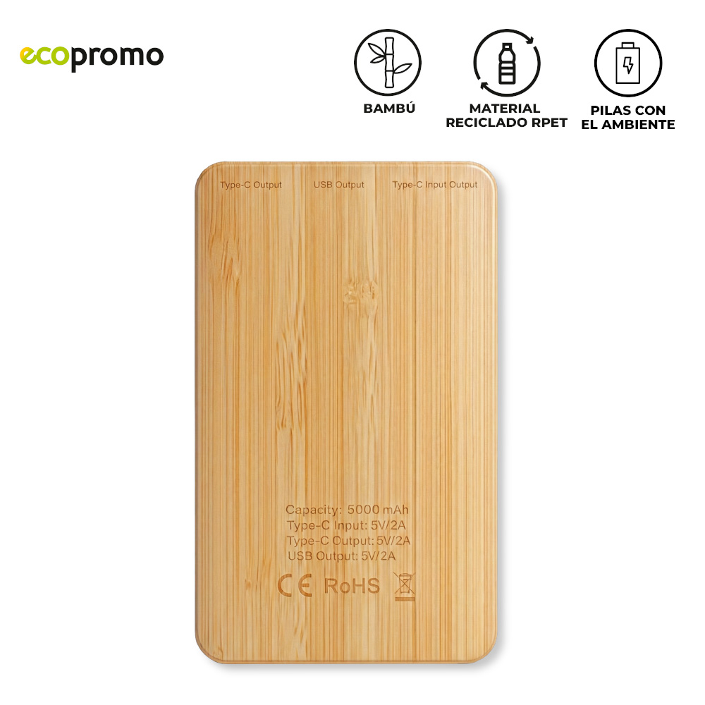 Pila recargable en bambú y poliéster reciclado RPET de 5000 mAh. Incluye cable tipo C para carga.