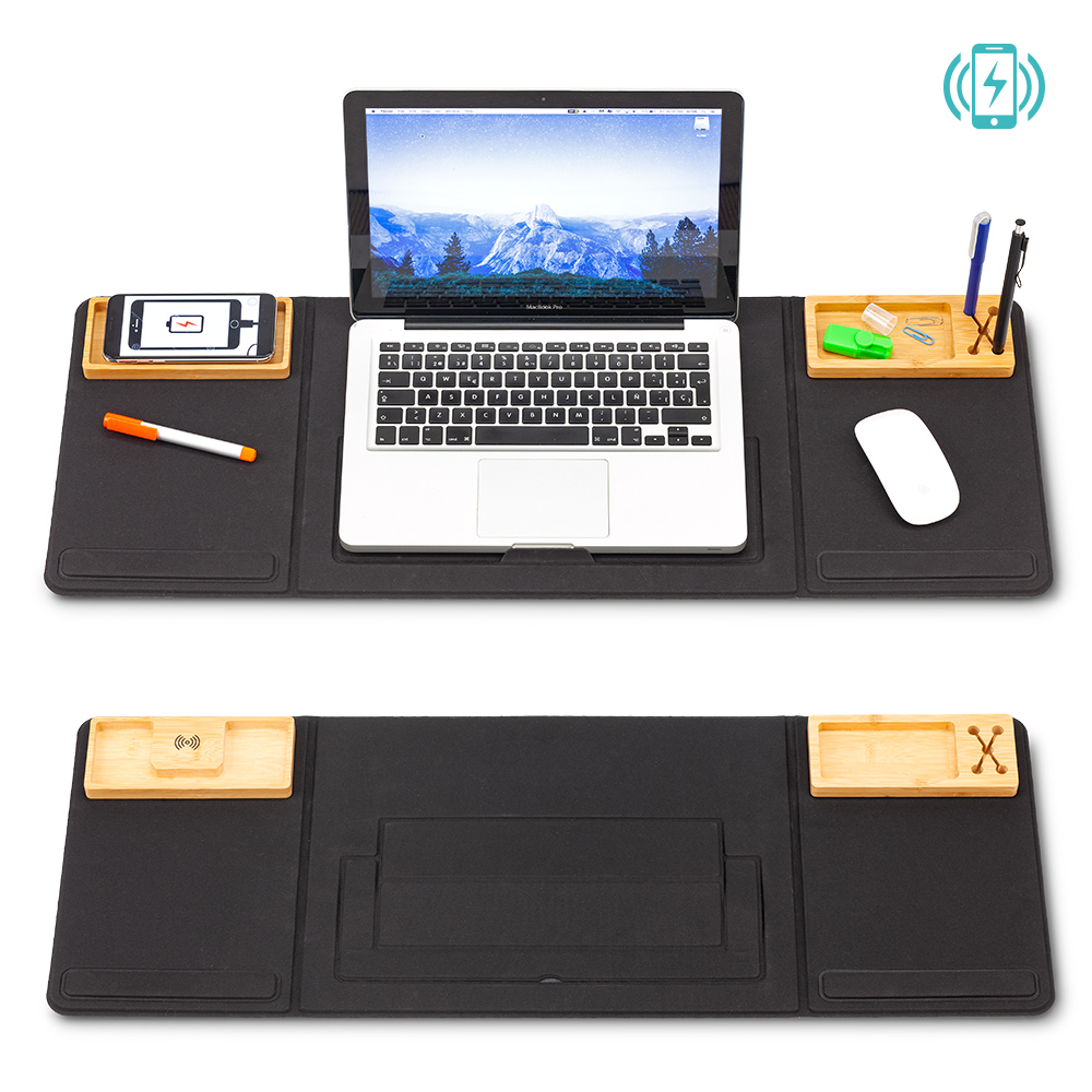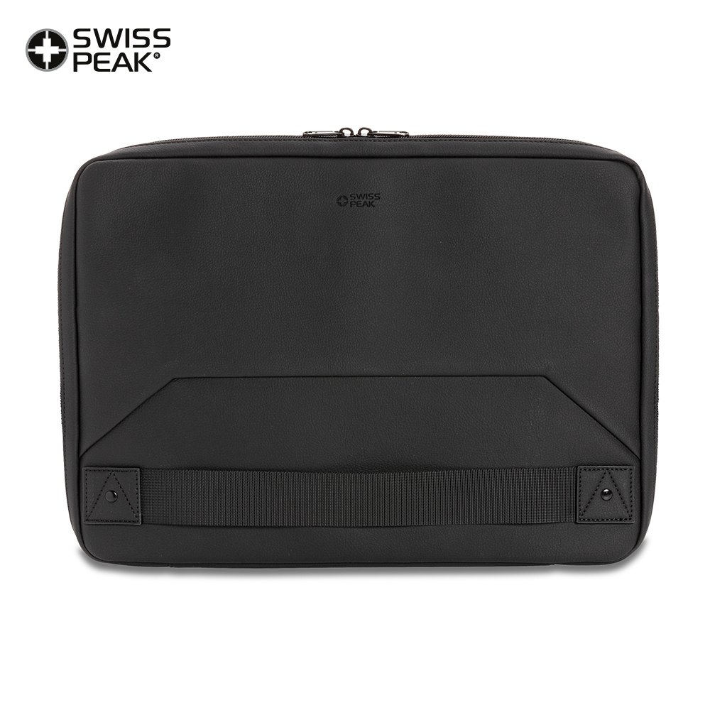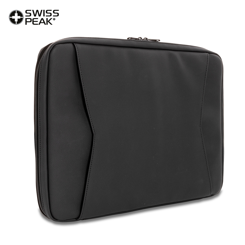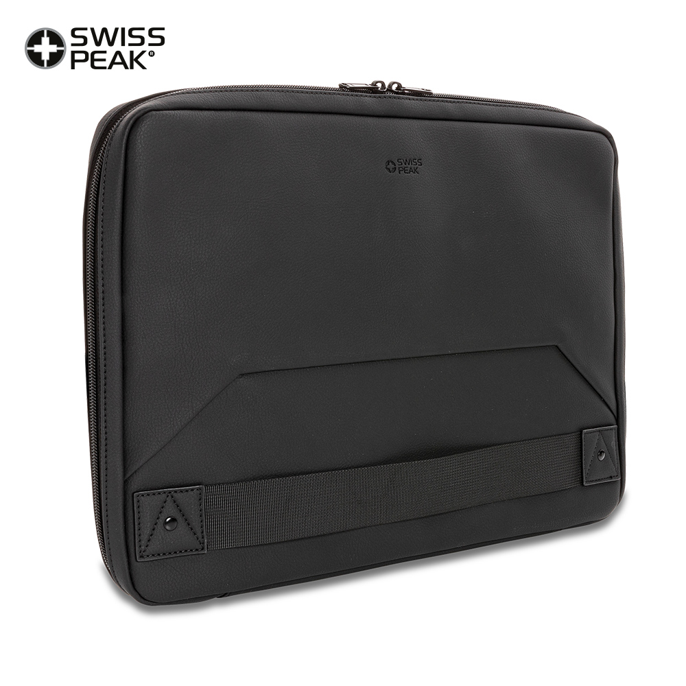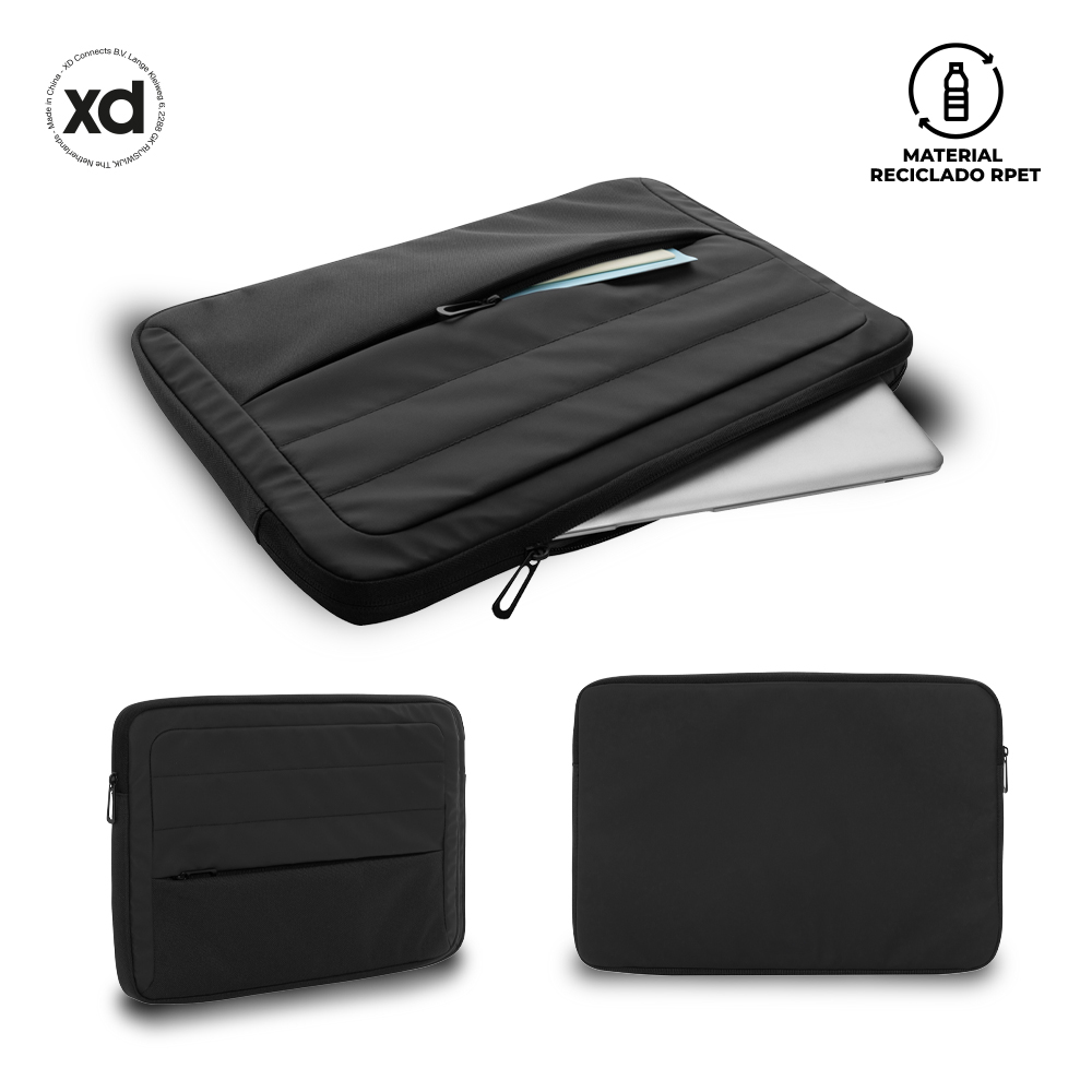 Estacion de trabajo con cierre de cremallera y correa de transporte elaborada en Poliuretano imitacion cuero Un bolsillo para portatil de hasta 15 6 pulgadas con cierre de velcro Al abrir los dos paneles la funda se transforma en una estacion de trabajo Cada panel cuenta con 3 bolsillos deslizantes y en el interior 5 ranuras para tarjetas y compartimento para documentos Correa para equipaje en la parte posterior Libre de PVC