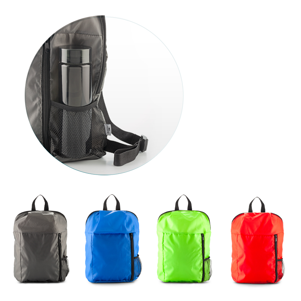 Morral en poliéster 600D, con bandas reflectivas, bolsillo frontal con cremallera y bolsillos laterales en malla portabotella.