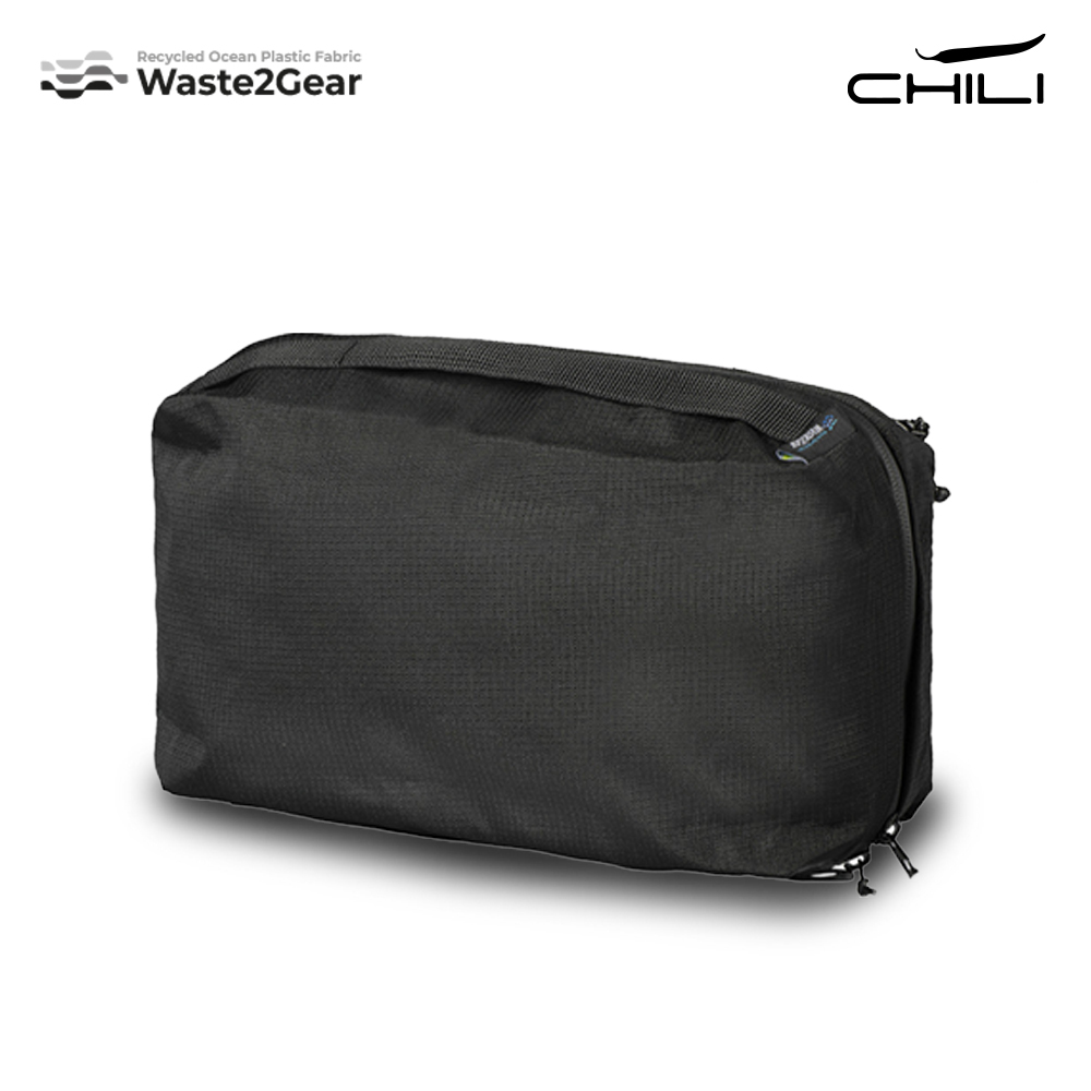 Organizador en poliéster reciclado de residuos plásticos recuperados del océano. Dos bolsillos externos con cremallera. Dos bolsillos internos de malla con cremallera. Gancho para colgar.