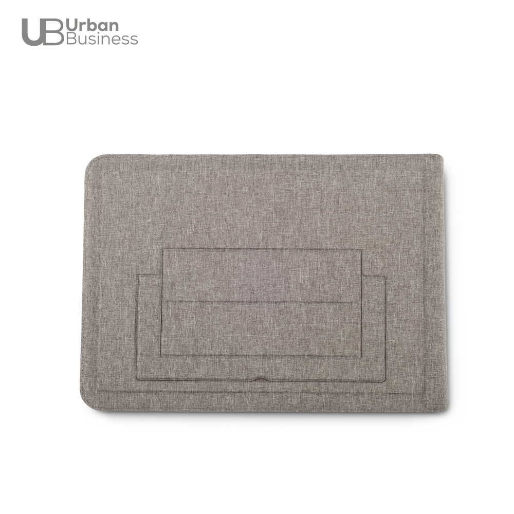 Soporte multiusos para trabajo en poliéster reciclado RPET. Tiene un soporte plegable el cuál se ajusta máximo a computadores de 16”, la solapa funciona cómo mouse pad y tiene un compartimiento para documentos. Empaque caja individual.