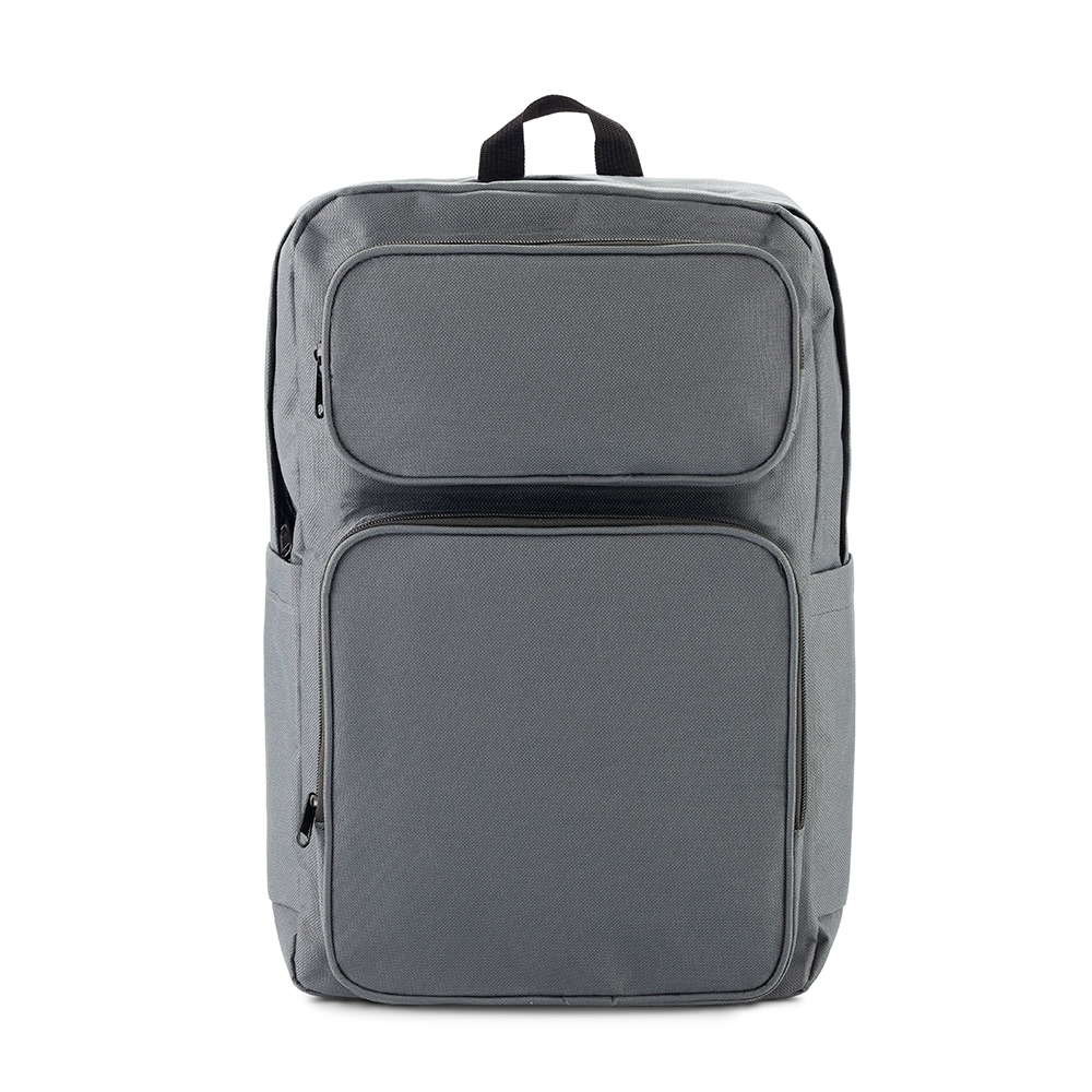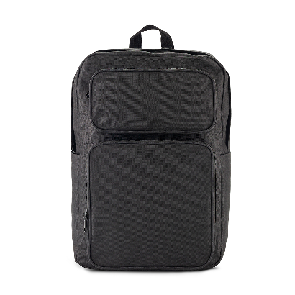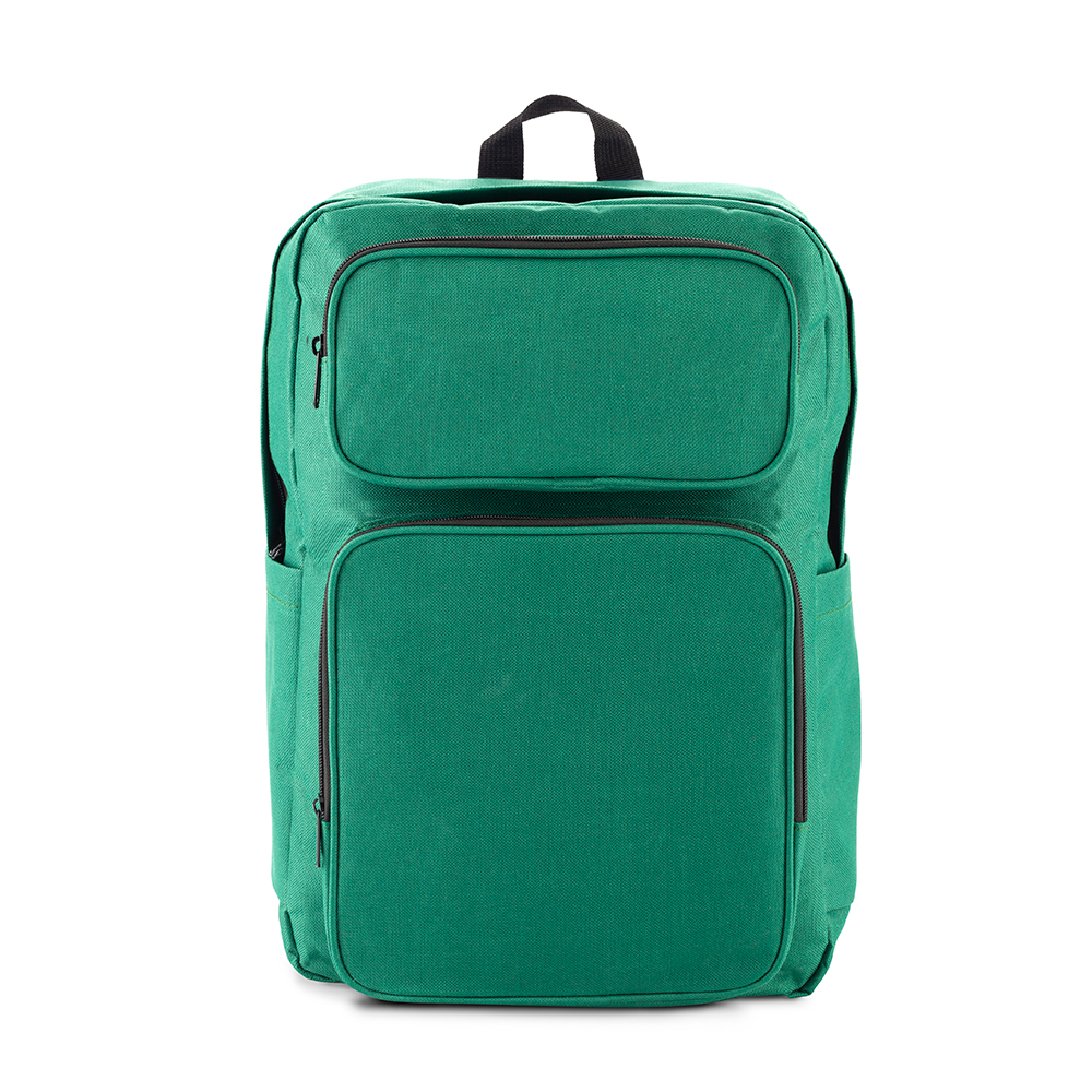 Morral backpack en poliéster. Apto para portátil de hasta 15”. Tres bolsillos externos con cremallera. Dos bolsillos laterales sin cremallera.