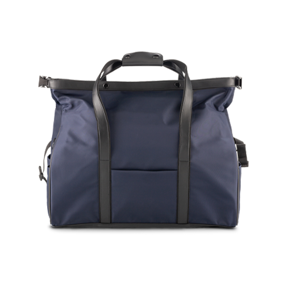 Maletín para viaje en nylon y correas cubiertas en imitación cuero. Un bolsillo frontal con botón de seguridad. Dos bolsillos laterales con botón de seguridad. Dos botones de seguridad y dos hebillas para el bolsillo principal. Banda posterior para enganchar en trolley. Tiene la posibilidad de cargarla por medio de dos manijas o reata para colgársela.