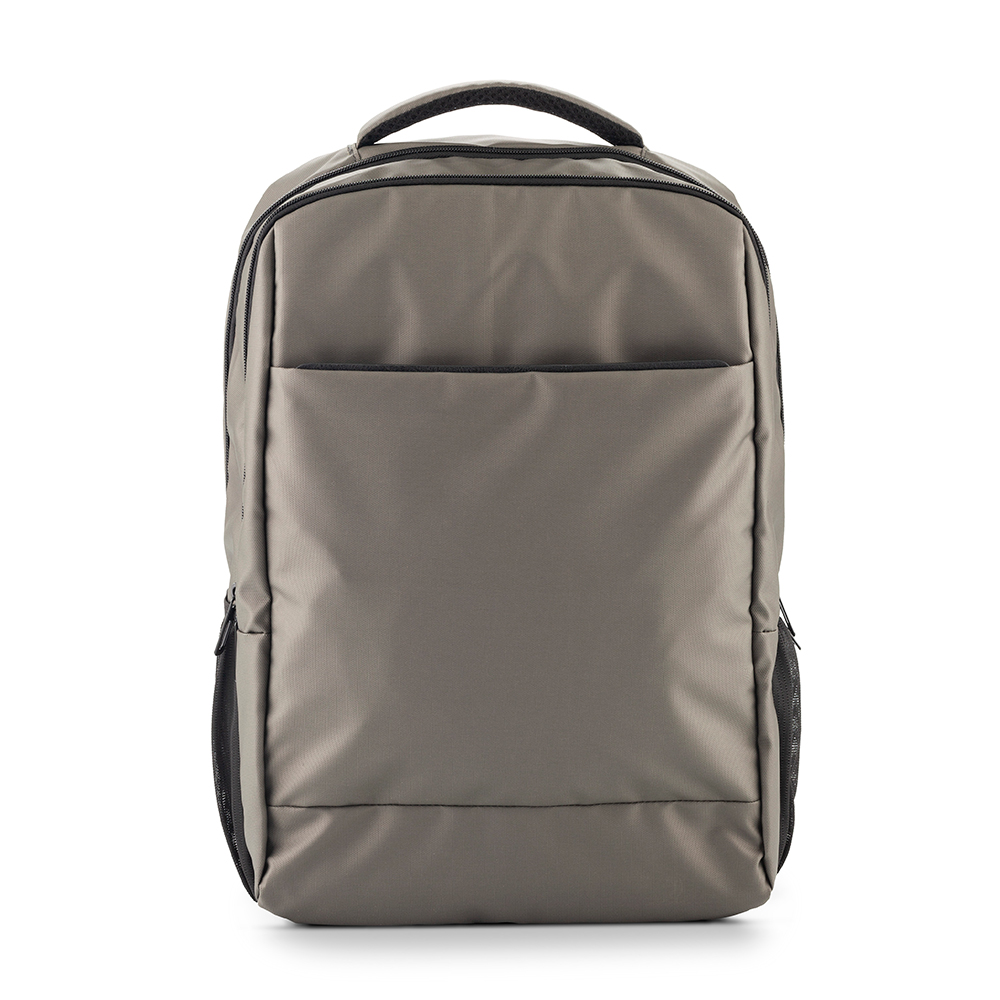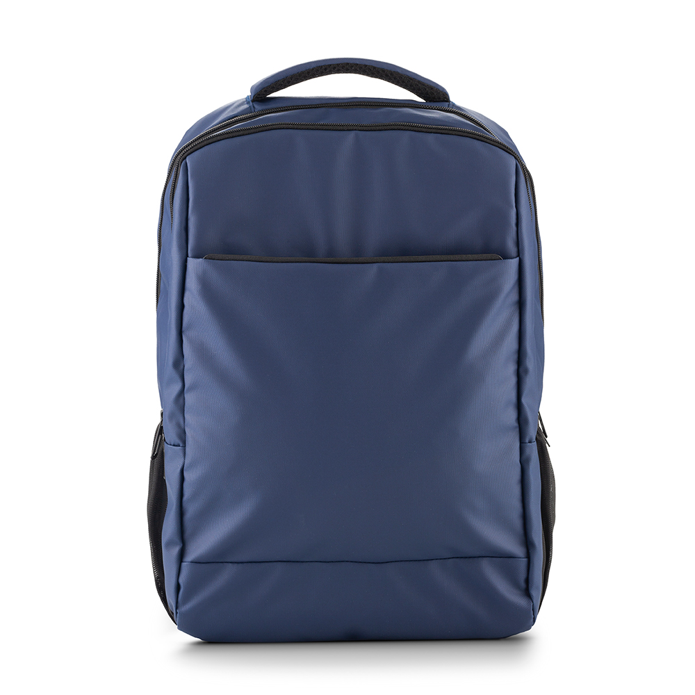 Morral backpack en poliéster. Apto para portátil de hasta 15". Tres bolsillos externos con cremallera. Dos bolsillos laterales en malla. Banda posterior para enganchar en trolley.