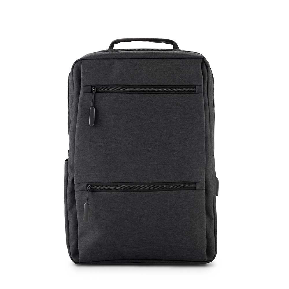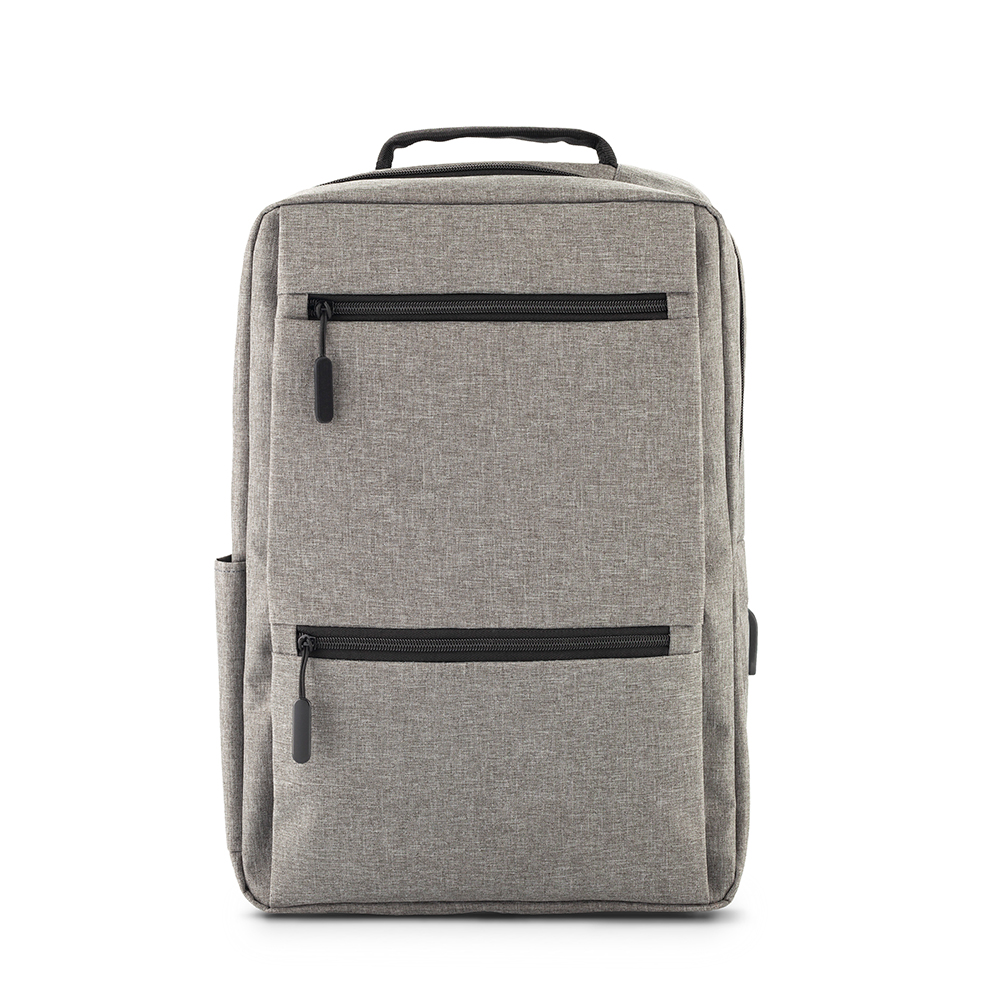 Morral backpack en poliéster. Apto para portátil de hasta 15". Tres bolsillos externos con cremallera. Un bolsillo lateral y puerto USB para cargar desde el interior (no incluye pila).