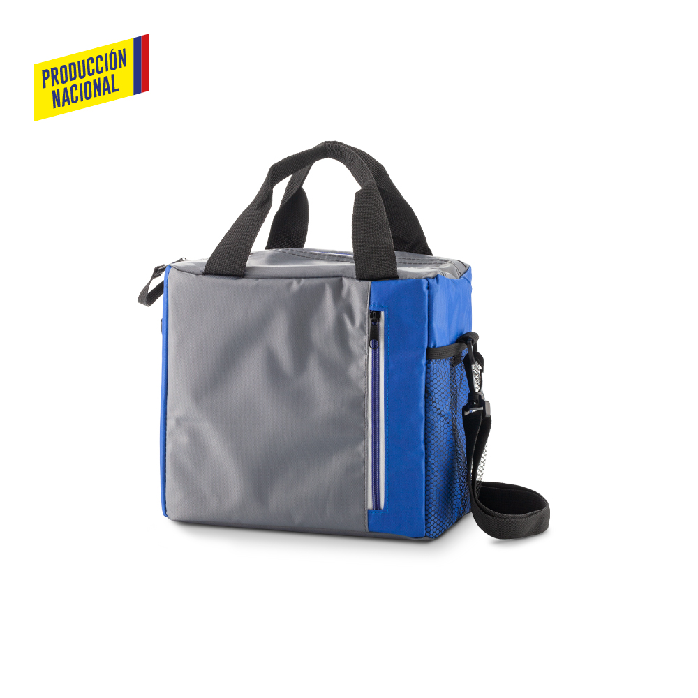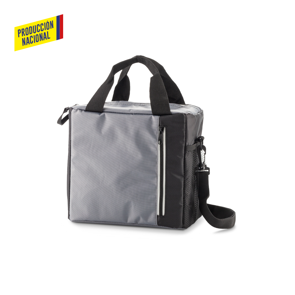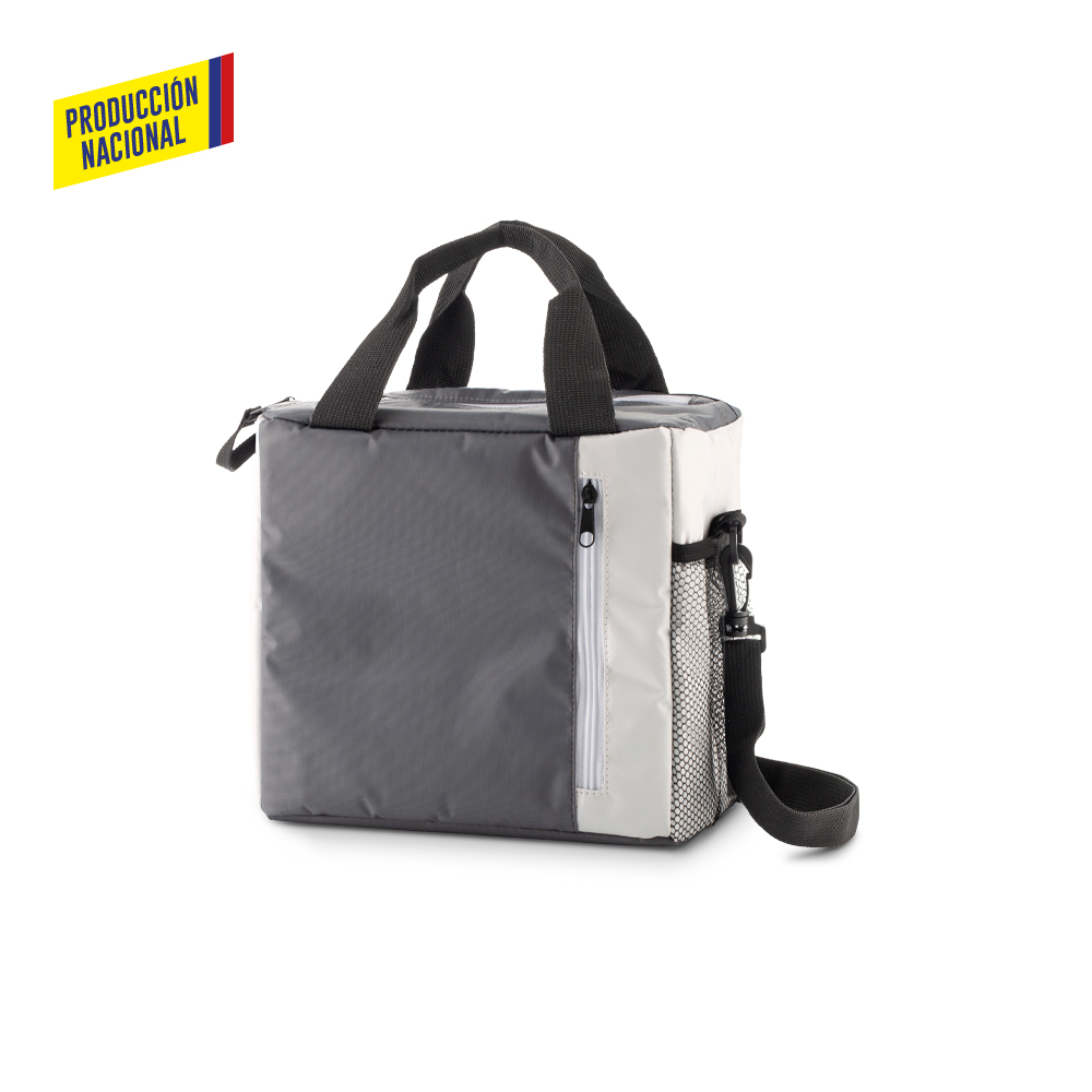 Nevera en poliéster con interior en PVC y cierre en cremallera. Un bolsillo externo con cremallera. Un bolsillo lateral en malla.