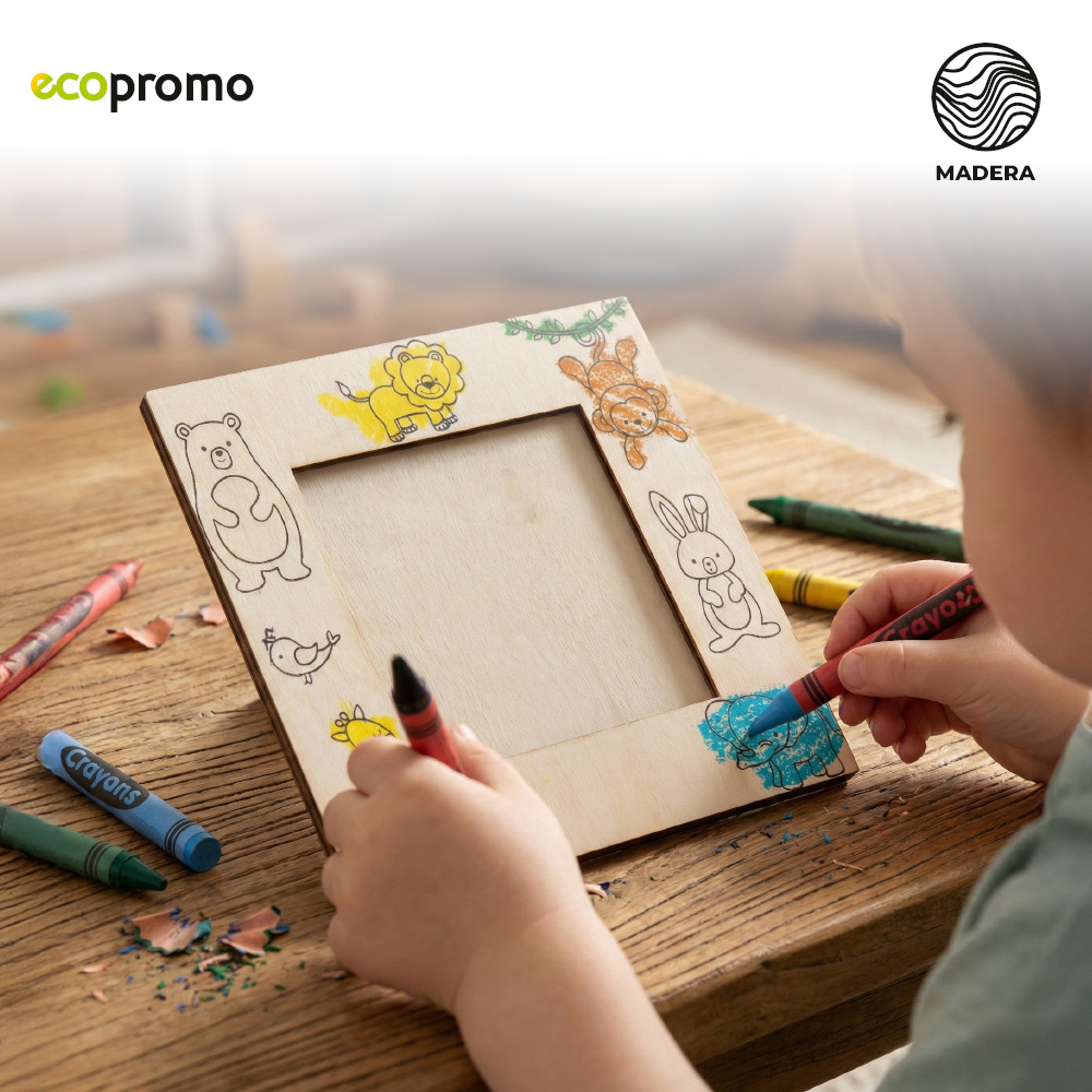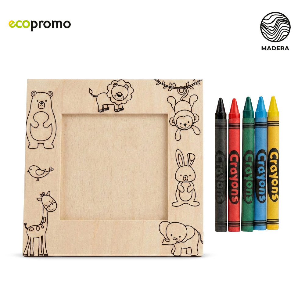 Portarretrato en madera natural con diseños de animales. Incluye crayolas de colores para poder decorar el marco.