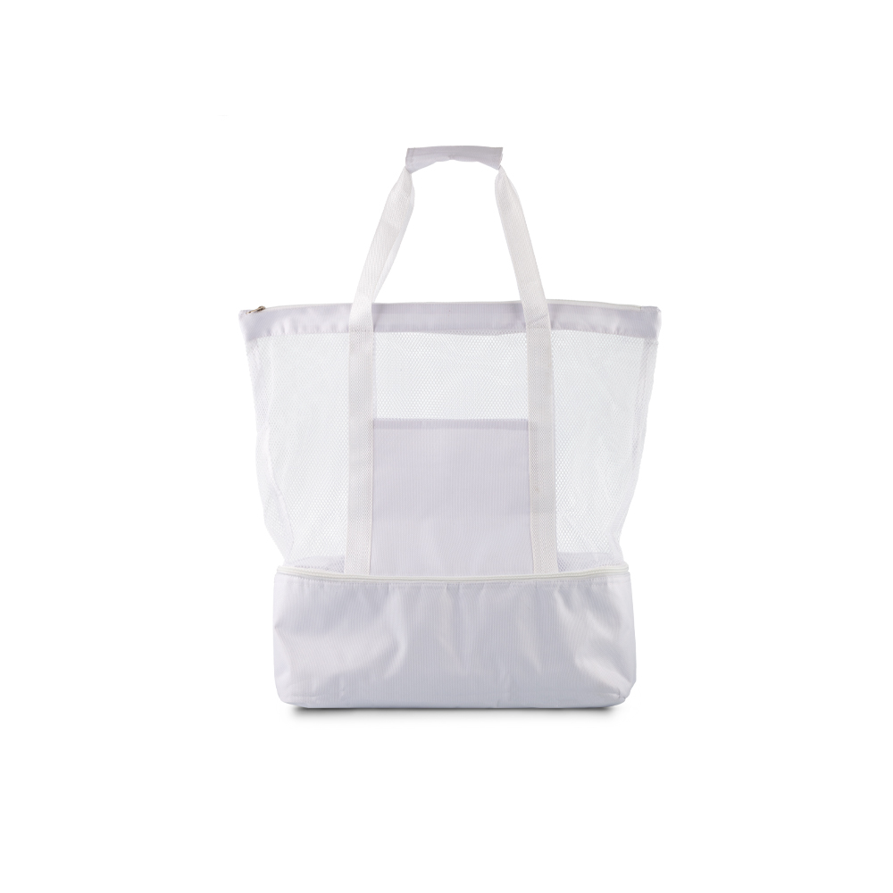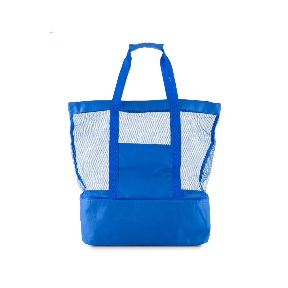 Bolsa nevera en lona poliéster. Un bolsillo principal en malla. Un bolsillo secundario el cual funciona como cooler bag.