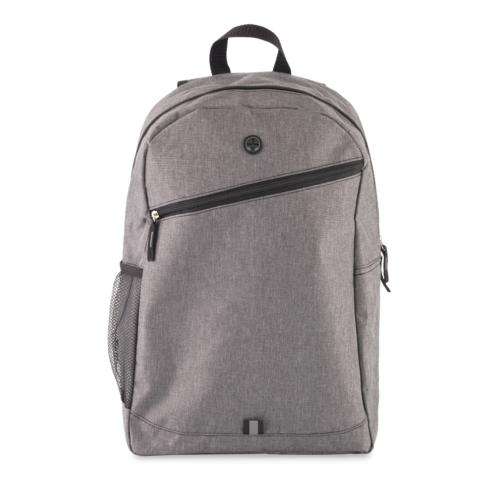 Morral backpack en poliéster, un bolsillo lateral externo de malla y uno frontal con cremallera. Espaldar acolchado. Apto para portátil de 15”.