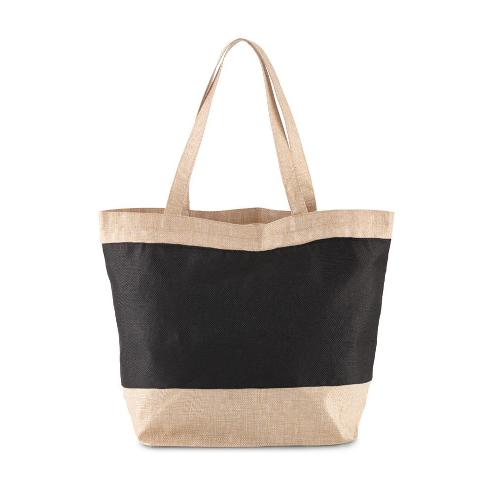 Bolsa en poliéster imitación yute con manijas. Medidas: 47 cm x 33 cm x 15.5 cm fuelle.