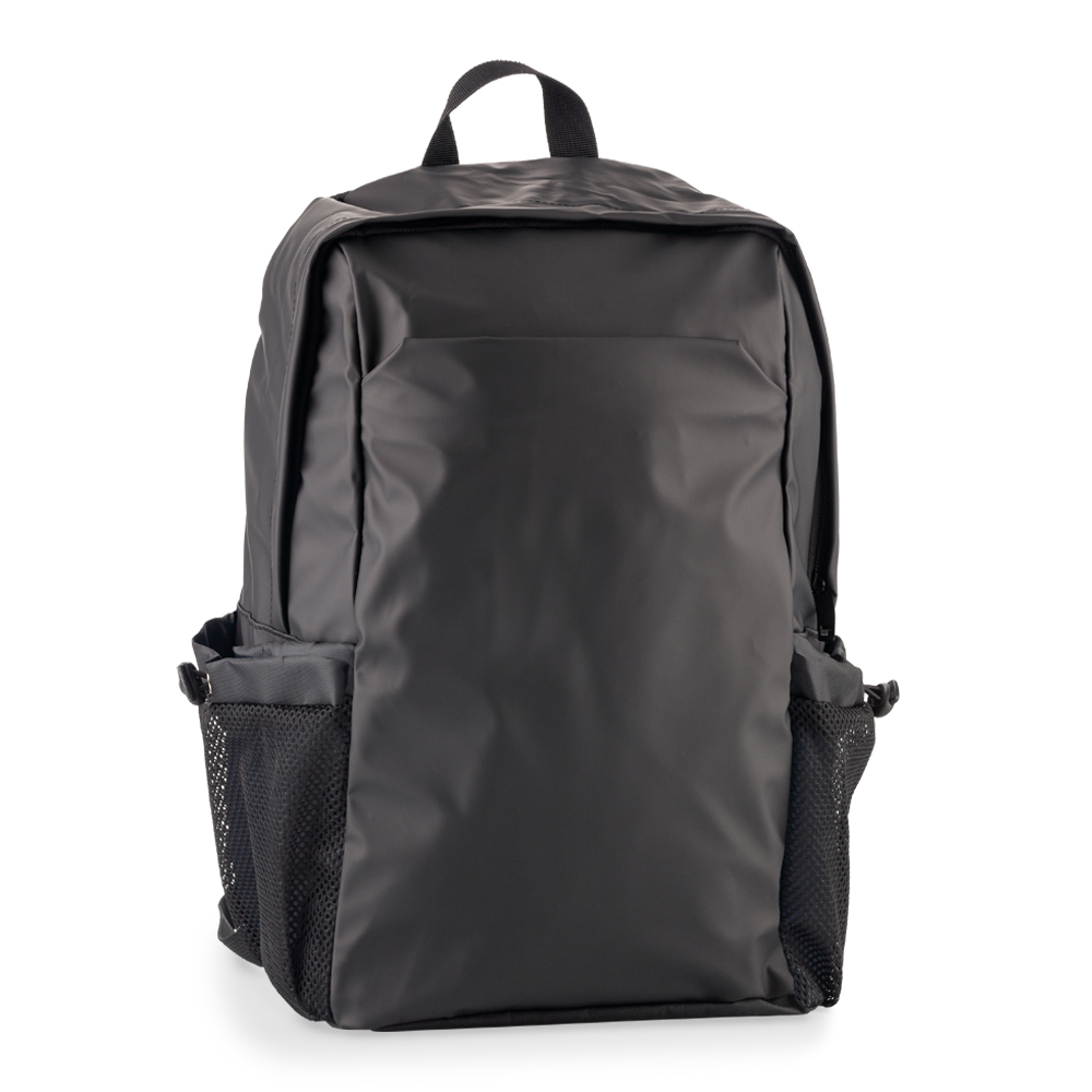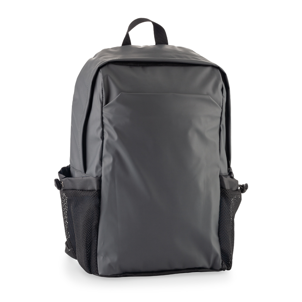 Morral backpack en poliuretano. Dos bolsillos laterales con malla . Apto para portátil de 15”. Espaldar acolchado.