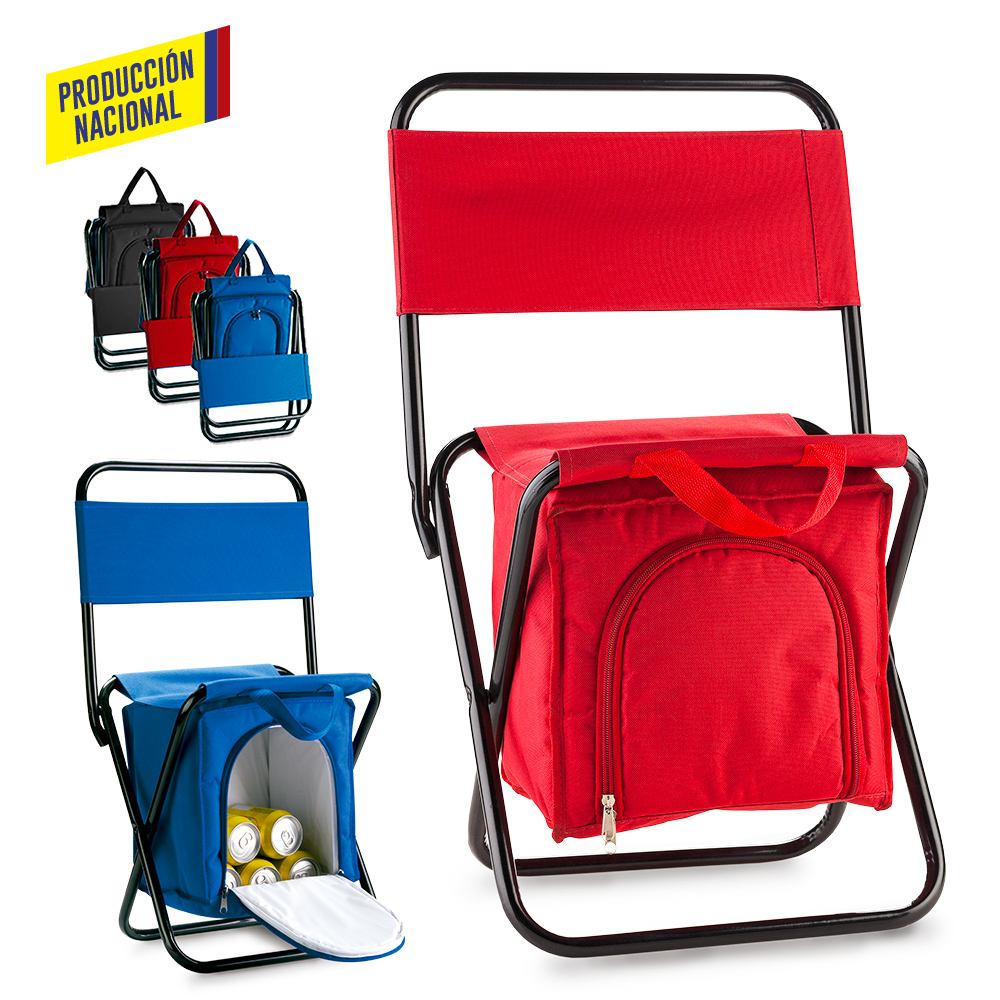 Silla plegable en poliéster con soporte metálico. Resistencia 100 kg. Grosor del tubo 13.5 mm. Estuche en poliéster.